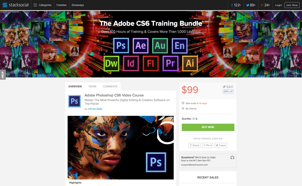 Il prezzo di listino di The Adobe CS6 Training Bundle che, lo ribadiamo, è in lingua inglese è di 841 dollari, oltre 600 euro: grazie alla nuova promozione Stacksocial è possibile acquistarlo con l’88% di sconto, a solamente 99 dollari, circa 72 euro.