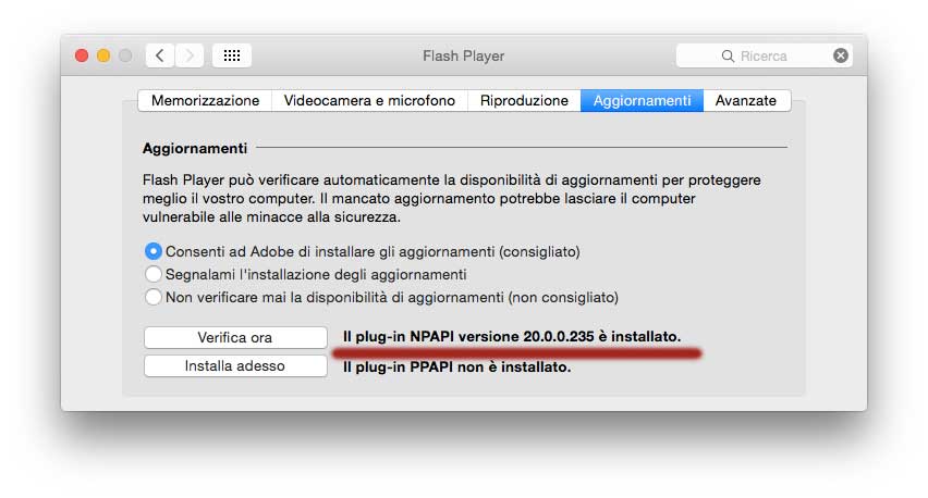 Se il Flash Player è installato nel vostro computer, dovrebbe aggiornarsi automaticamente. È possibile verificare manualmente l’update selezionando dalle Preferenze di Sistema la voce “Flash Player” e scegliendo “Verifica ora” dalla sezione “Aggiornamenti”. In alternativa il Flash Player completo di scarica da questo indirizzo. Google Chrome aggiorna separatamente e automaticamente il player Flash integrato nel sistema.