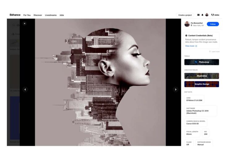 Le funzionalità di Content Credentials saranno integrate in tutti i prodotti della Creative Cloud. Con Photoshop, ad esempio, sarà disponibile come funzione attivabile su richiesta (opt-in); se attivo, il sistema registra modifiche e informazioni sull’identità dell’immagine, elementi integrati nell’esportazione dei file. A detta di Adobe i metadati sicuri offrono opzioni di trasparenza ad artisti e professionisti della creatività, rafforzando allo stesso tempo la fiducia nei contenuti digitali nelle persone che guardano tali contenuti.