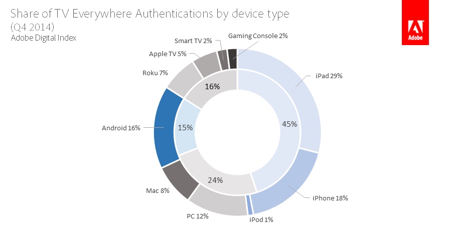 Anche se da più ricerche emerge un andamento calante per i tablet in generale e per iPad in particolare, l’analisi Adobe dipinge una situazione non del tutto negativa. In particolare iPad rimane con una percentuale del 29% il dispositivo preferito per lo streaming di programmi TV. Negli USA il dispositivo più usato per questo scopo è Roku, mentre scende la percentuale di contenuti visualizzati con Apple TV: console e altre piattaforme per lo streaming hanno visto incrementare le visioni del 50% mentre la piattaforma Apple TV è scesa del 21% nello stesso periodo esaminato.