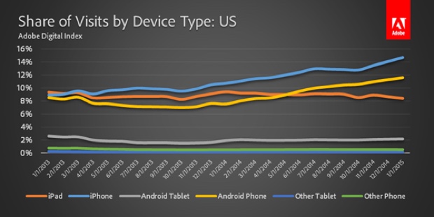 adobe digital index 2 2015Per quanto riguarda la navigazione emerge la concorrenza dei phablet con i tablet tradizionali, con un calo del 5,5% negli USA, che per iPad passa dal 7,2% al 6,6%. Secondo Adobe il grande successo dei phablet, tra cui rientra anche iPhone 6 Plus, sta relegando i tablet a un settore di nicchia. Ciò nonostante iPad conta ancora oltre il 70% di percentuale di navigazione in più della metà di 40 paesi esaminati, toccando quota 77% in USA e persino l’81% in Cina, quindi anche in mercati più sensibili al prezzo.