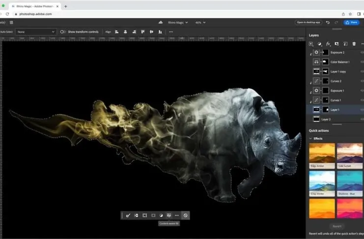La versione web non include tutte le funzionalità di Photoshop classico ma sono ora presenti funzioni per selezionare oggetti, rimuovere sfondi, per la regolazione delle immagini e per la rimozione di oggetti con il Riempimento in base al contenuto (per riempire le parti selezionate di un’immagine con contenuti campionati da altre parti dell’immagine.