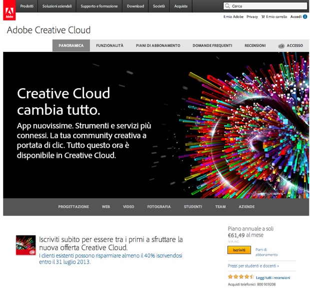 Ricordiamo che fino al 31 luglio sono disponibili offerte speciali e sconti per gli utenti che già possiedono le versioni precedenti di Creative Suite, a partire dalla CS3 in poi, basta solamente possedere anche un solo programma. In questo caso è possibile abbonarsi per l’utilizzo di una sola app Creative Cloud a partire da 12,29 euro al mese con un risparmio fino al 50% per il primo anno. Per chi invece possiede almeno un prodotto tra la CS3, CS4, CS5 e CS5.5 è possibile abbonarsi alla nuova Creative Cloud completa al prezzo scontato di 36,89 euro al mese, in pratica uno sconto del 40% valido per il primo anno. Lo sconto sale fino al 60% invece per chi possiede almeno un prodotto CS6: in questo caso è possibile abbonarsi alla Creative Cloud completa a soli 24,59 euro al mese per il primo anno.