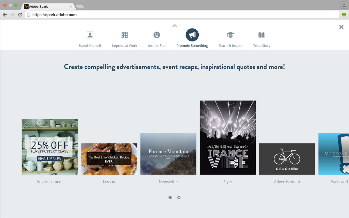 Il servizio e le funzioni di Adobe Spark sono perfetti per creare presentazioni, libri, newsletter settimanali, report di viaggi. Le pagine mostrate si adattano automaticamente ai dispositivi quali tablet, computer e smartphone, senza bisogno di creare presentazioni specifiche per i singoli dispositivi.