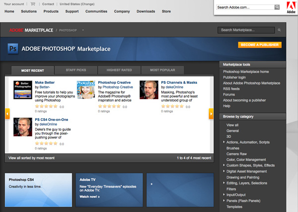 Nel momento in cui scriviamo le numerose sezioni del negozio online offrono un numero limitato di prodotti e corsi, con l’unica eccezione rappresentata da diverse video lezioni del guru Deke McClelland. Sembrano assenti contenuti in lingua italiana, mentre diverse sezioni sono al momento completamente vuote anche se, come è presumibile la situazione è destinata a cambiare nel corso del tempo. Adobe ha dichiarato che a differenza di altri siti dedicati a Photoshop e ufficialmente sostenuti, il nuovo market place si propone di diventare il punto di riferimento per la comunità degli utenti e che sarà aggiornato con frequenza. Adobe Photoshop Market Place può essere raggiunto a partire da questo collegamento.