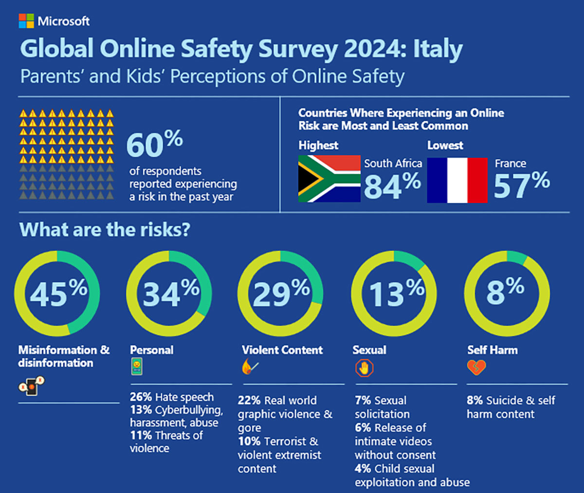 - Disinformazione (45%), rischi per la persona – come hate speech, cyberbullismo, minacce – (34%) e contenuti violenti (32%) sono i rischi più comuni riscontrati in Italia.