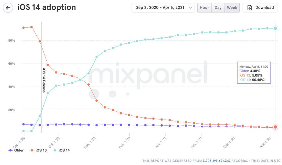 Per di più l’adozione iOS 14 al 90%, per la precisione al 90,46%, risulta in linea e in crescita del 4% con l’ultimo dato pubblicato direttamente da Apple che nel mese di febbraio 2021 indicava una adozione iOS 14 pari all’’ 86% per tutti i dispositivi iPhone e iPad introdotti negli ultimi 4 anni. Così la crescita del 4% è stata effettuata in poco più di un mese.