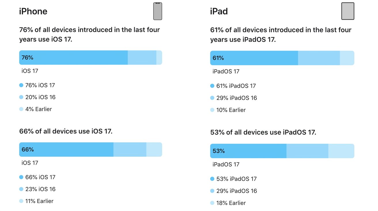 Sul 66% di tutti gli iPhone attivi è presente iOS 17, sul 23% è presente iOS 16 e sull’11% una precedente versione di iOS.