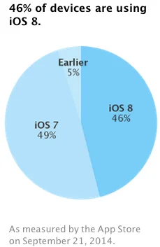Record di adozione iOS 8: in meno di una settimana già il 46% degli iPhone, iPod touch e iPad attualmente in circolazione sono stati aggiornati all’ultimo sistema operativo mobile rilasciato da Apple. Questo quanto si evince dal grafico a torta pubblicato dalla stessa Apple all’interno della pagina di supporto per sviluppatori monitorando gli accessi all’applicazione App Store.