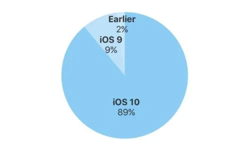 Il classico grafico a torta vede iOS 9 al 9% di adozioni, complici sicuramente quei dispositivi che non risultano compatibili con iOS 10. Quasi assenti, invece, le versioni di sistema più risalenti nel tempo, che nel complesso contano invece il 2% delle installazioni. In quest’ultimo caso si tratta di device davvero datati, che probabilmente non risultano più compatibili nemmeno con gli applicativi più recenti disponibili sullo store digitale di Cupertino.
