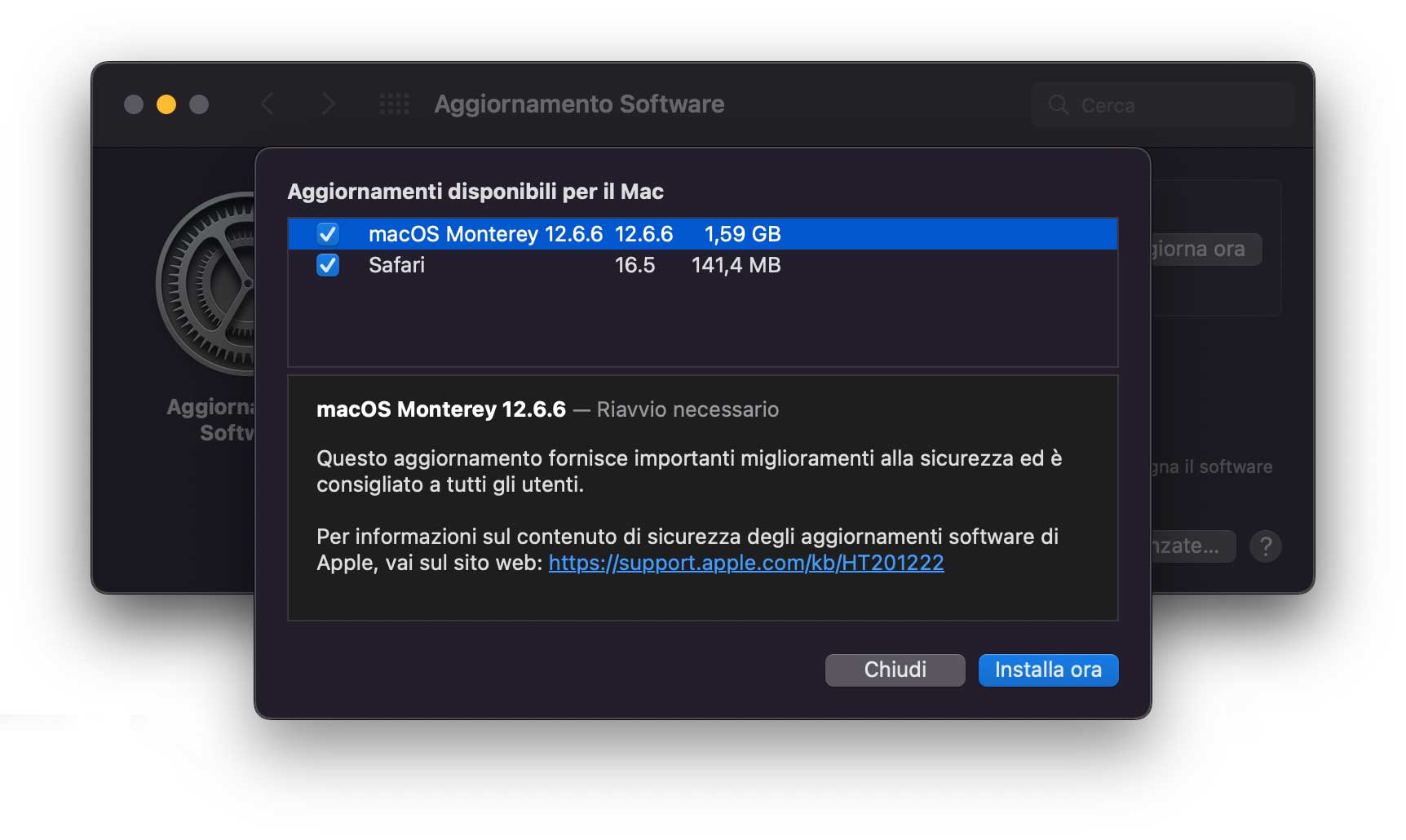 Se non volete ancora installare macOS Ventura, potete ottenere l’update aprendo le Preferenze di Sistema e selezionando “Aggiornamento software”: da qui è possibile installare il nuovo macOS Ventura, oppure aggiornare semplicemente l’attuale sistema selezionando dalla finestra in questione la voce “Ulteriori informazioni” e installando l’update per Big Sur o macOS Monterey.