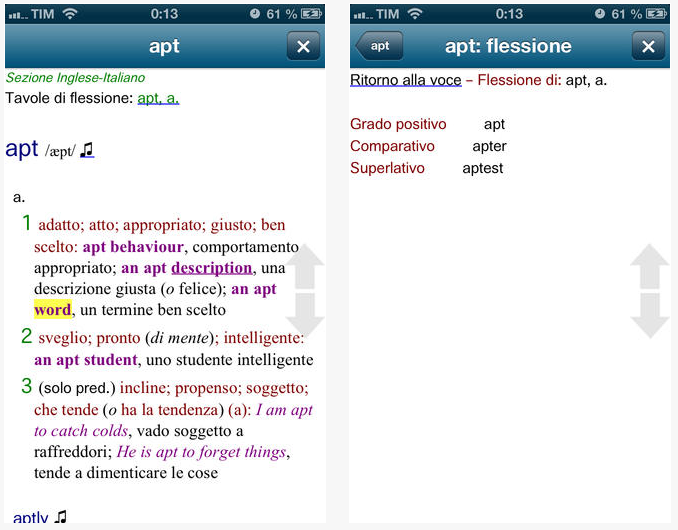 Con Il Ragazzini di Zanichelli editore, con il proprio iPhone o iPad si potranno consultare in ogni momento, senza la necessità di una connessione ad Internet, 400mila voci, 13mila sinonimi e contrari inglese, 4300 parole dell’inglese di base, 160 note sulla civiltà dei paesi di lingua inglese con informazioni su istituzioni, storia, sistema scolastico e sport, 600 note d’uso che riguardano sfumature di significato, errori comuni, qustioni grammaticali di base e problemi comuni di traduzione, una sezione Dialoghi che raccoglie, divise per 170 situazioni di vita quotidiana, oltre 2mila frasi d’uso comune dell’inglese parlato. Se si dispone di un collegamento a internet è possibile acsoltare la pronuncia corretta di tutti i lemmi cliccando sull’icona a forma di nota musicale.