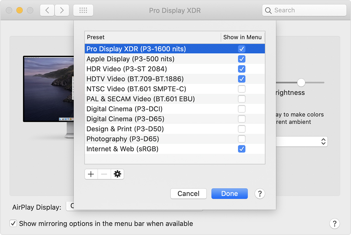 L’Apple Pro Display XDR include diverse modalità di riferimento adatte per vari ambienti e flussi di lavoro di produzione. Le modalità di riferimento possono essere cambiate in due modi diversi sul Mac: dalle Preferenze di Sistema, poi facendo clic su Monitor, da qui si seleziona il menu a comparsa Preset e si sceglie una modalità di riferimento. È anche possibile fare clic sul menu a comparsa Preset e scegliere “Personalizza”.