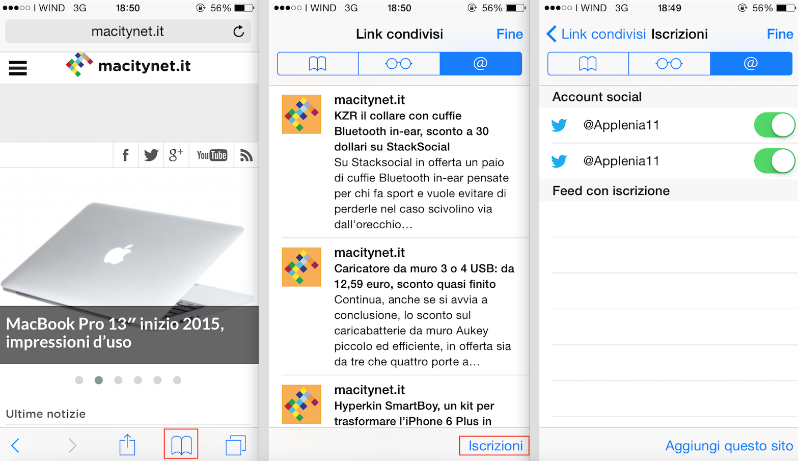 Per prima cosa è necessario aprire la pagina web di proprio interesse. Affinché il procedimento vada a buon fine, naturalmente, è necessario che la pagina prescelta disponga di un servizio di Feed RSS attivo e funzionante. Nel nostro esempio, ovviamente, prendiamo come riferimento Macitynet. Dopo aver aperto la pagina direttamente da iPhone o iPad è sufficiente cliccare sull’icona a forma di libro in basso e, successivamente, sul terzo tab con l’icona a forma di chiocciola chiamato Link condivisi. Da qui, sarà sufficiente premere il pulsante Iscrizioni in basso. Dalla schermata che si apre, infine, sarà necessario cliccare su Aggiungi questo sito. Questa operazione dovrà essere ripetuta per ogni sito di proprio interesse, dal quale si desidera i feed.