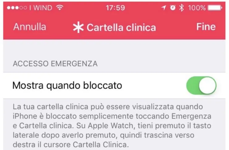 Per accedere ai vostri dati personali e’ sufficiente accedere alla schermata di blocco del telefono, premere sulla scritta “Emergenza” in basso a sinistra e poi toccare “Cartella Clinica”: vi appariranno i dati fondamentali della cartella che avete ritenuto di rendere pubblici (allergie, medicinali salvavita etc…) e la lista dei numeri di emergenza che sarà possibile chiamare direttamente con il vostro telefono.
