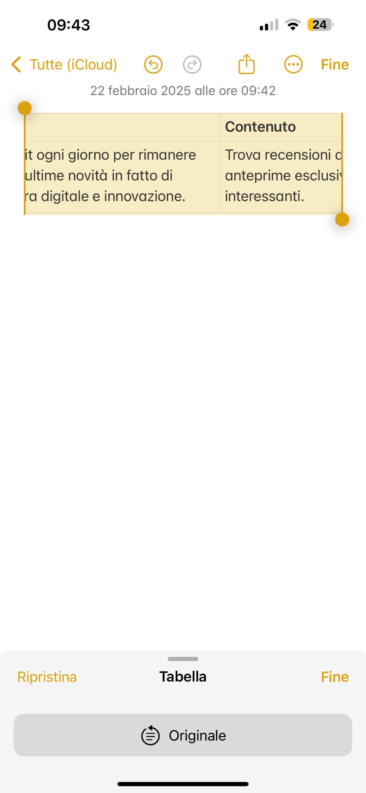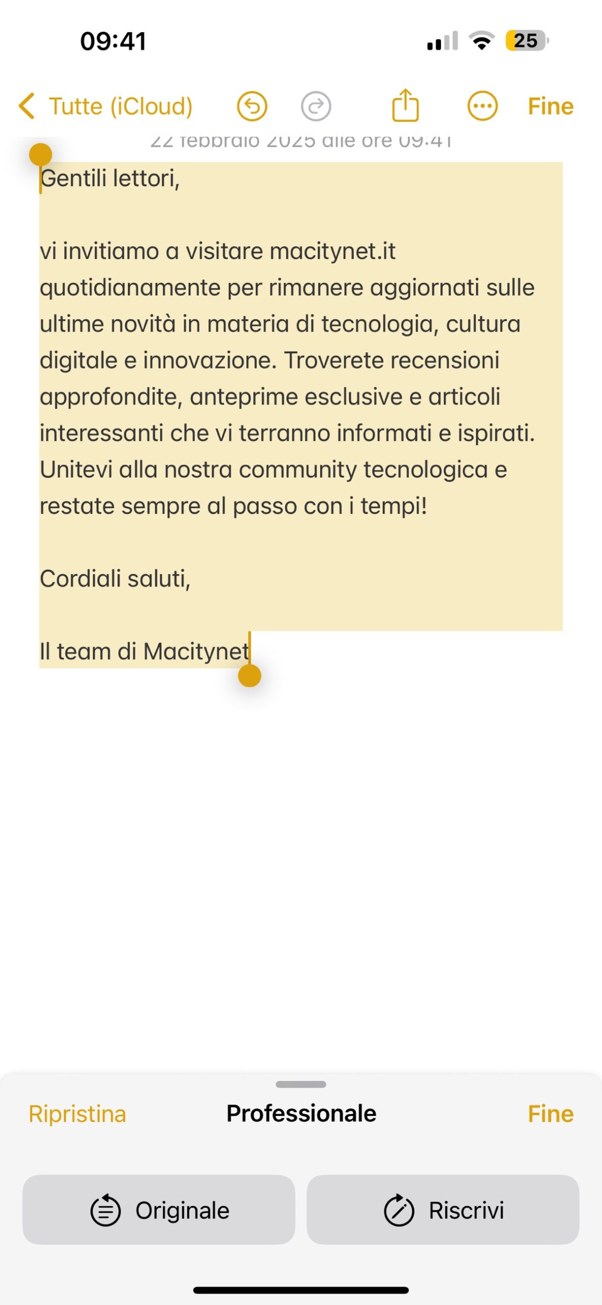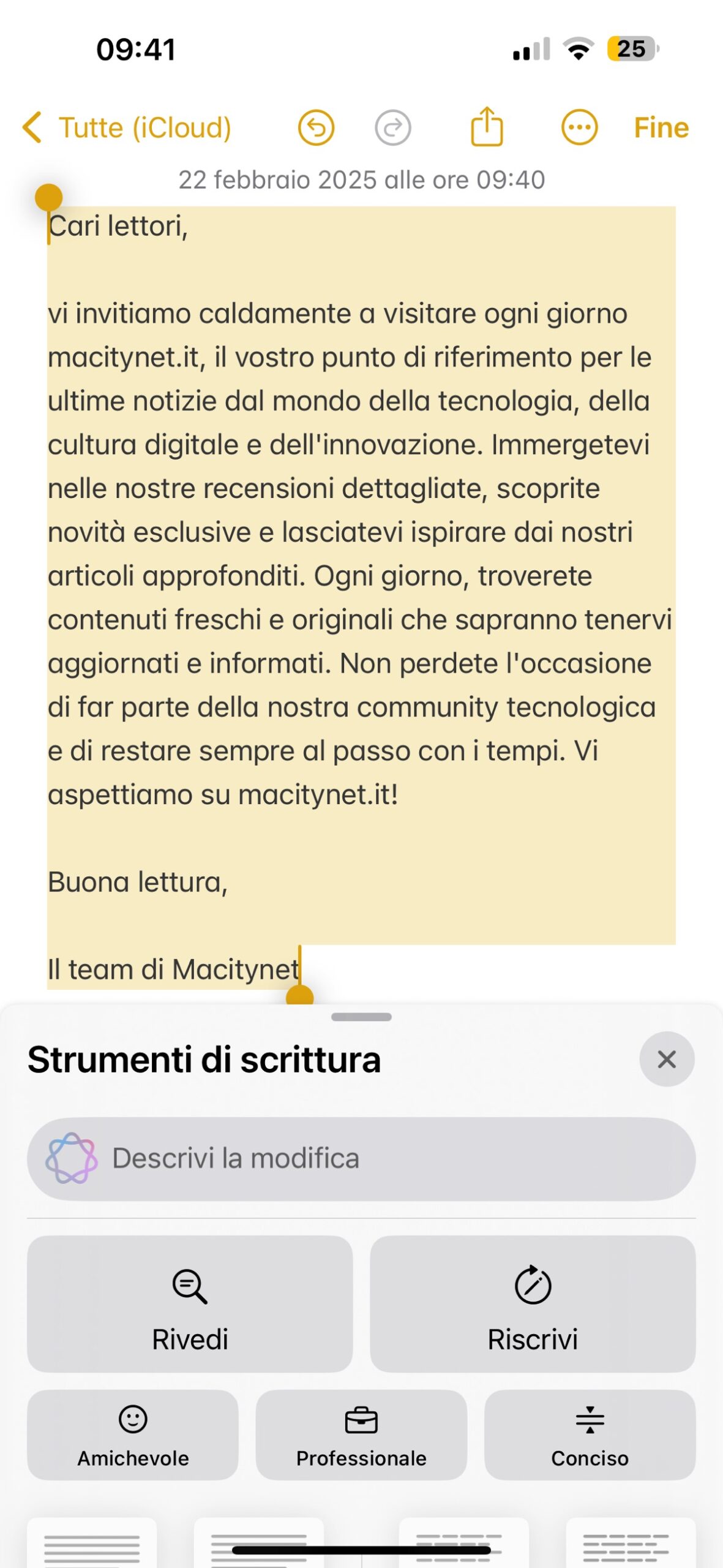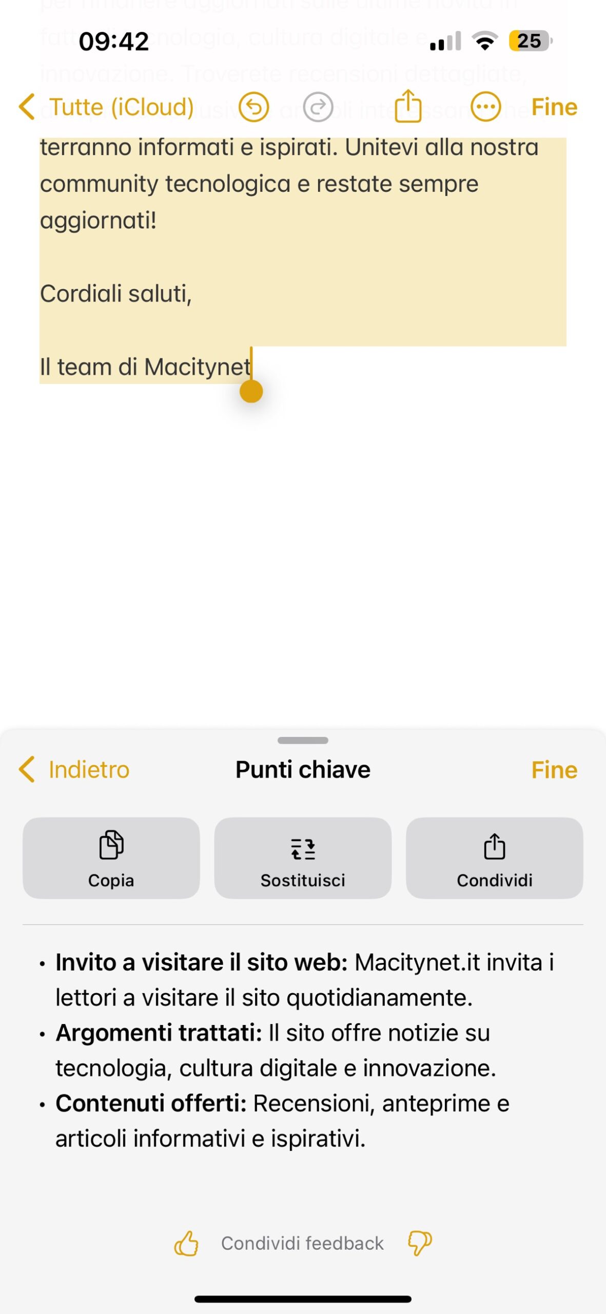 Nell’esempio qui sotto ci siamo fatti scrivere un testo di presentazione di Macitynet da ChatGPT e l’abbiamo fatto correggere, riassumere e pure intabellare da Apple Intelligence