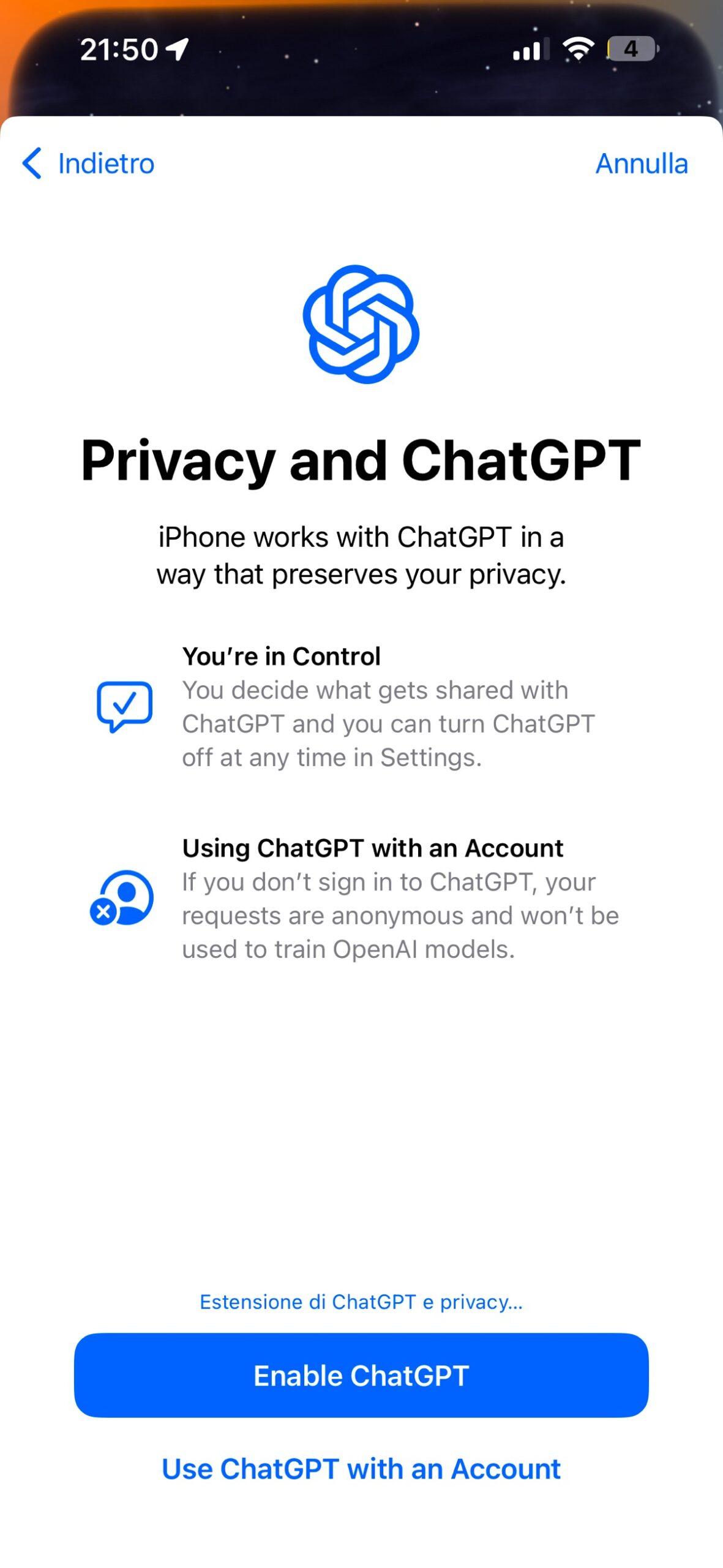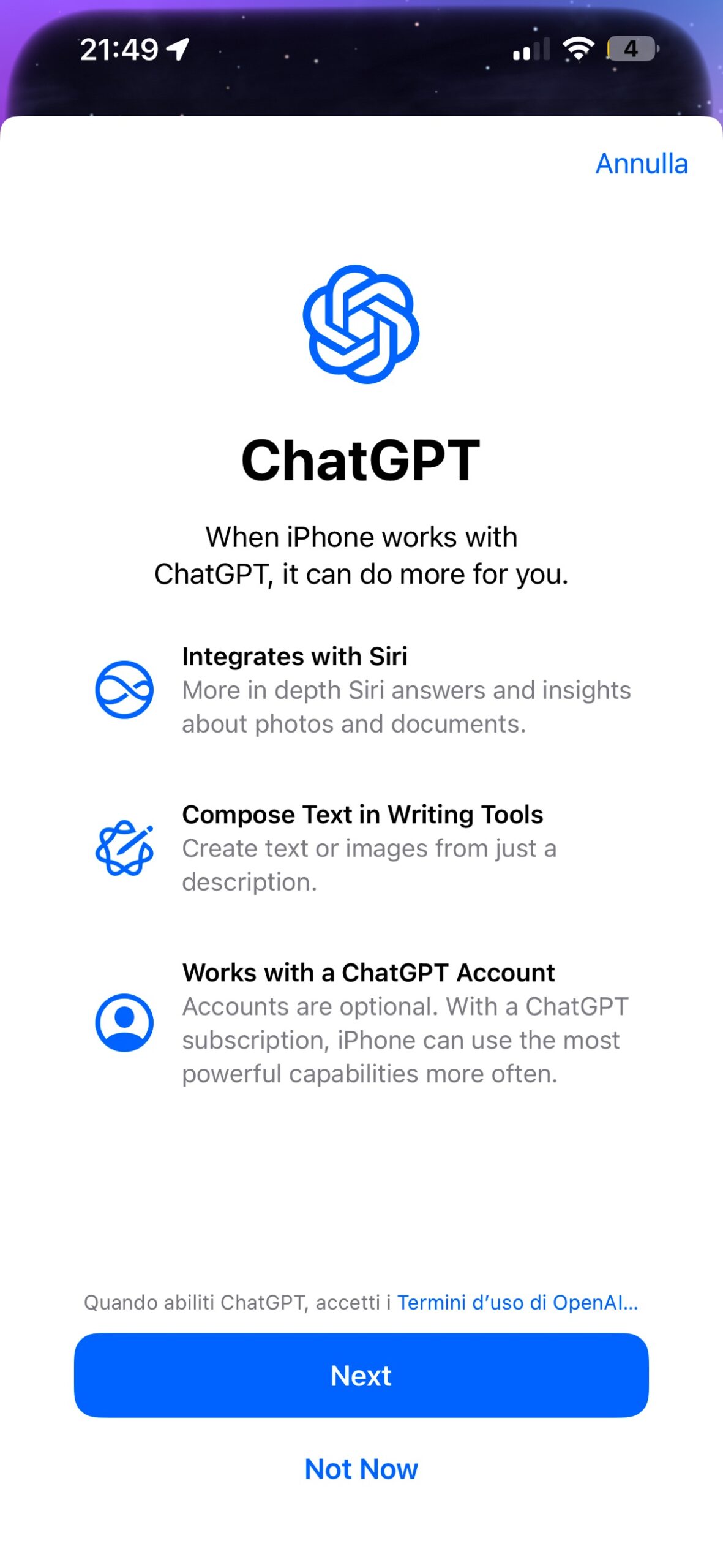 Tornando a Apple Intelligence, Apple ha previsto l’aggiunta di nuove funzioni nei prossimi mesi, incluse novità per Siri: in fase di avvio avete la possibilità di scegliere 4 diverse voci del tutto nuove. È possibile abilitare ChatGPT con Siri aprendo Impostazioni > Apple Intelligence e Siri, da qui nella sezione “Estensioni” > ChatGPT è possibile indicare il proprio account ChatGPT.