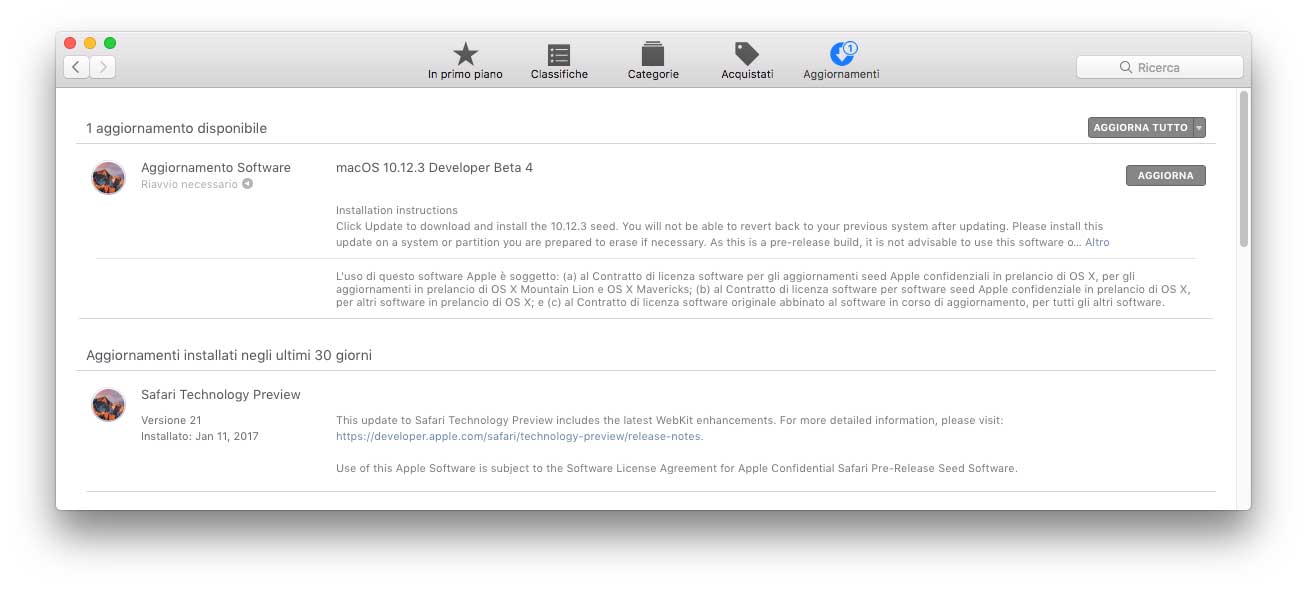A pochi giorni di distanza dalla precedente, Apple ha rilasciato una nuova beta (la quarta) del futuro update a macOS Sierra 10.12.3. Come sempre la nuova build (16D30a) è disponibile per chi ha la precedente beta (16D25a) dalla sezione “Aggiornamenti” del Mac App Store.