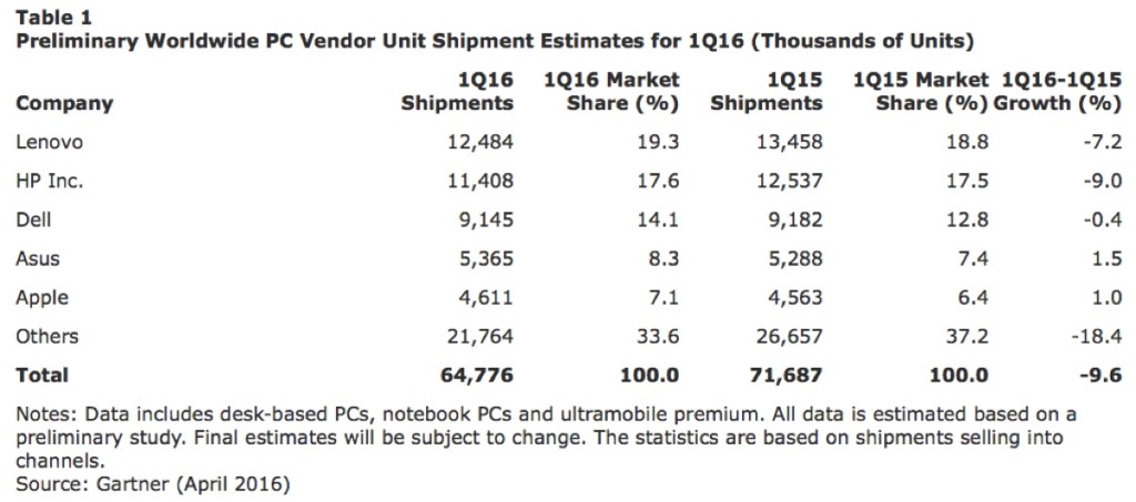 Trimestre su trimestre prosegue l’agonia spedizioni dei PC Windows: tutti i principali costruttori registrano cali consistenti delle spedizioni nel primo trimestre 2016. Nonostante alcune differenze tra i dati IDC e Gartner, Apple cala meno della media degli altri costruttori con il risultato che la quota di mercato dei Mac migliora ulteriormente.