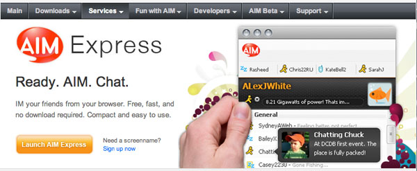 Siete all’estero, presso un amico o un conoscente e non avete sottomano il vostro Mac, il vostro iPhone o touch con AIM e volete chattare in tutta libertà ? Ora potete farlo senza registrazione a servizi terzi semplicemente accedendo a questa pagina e premendo sul bottone “Launch AIM Express”.