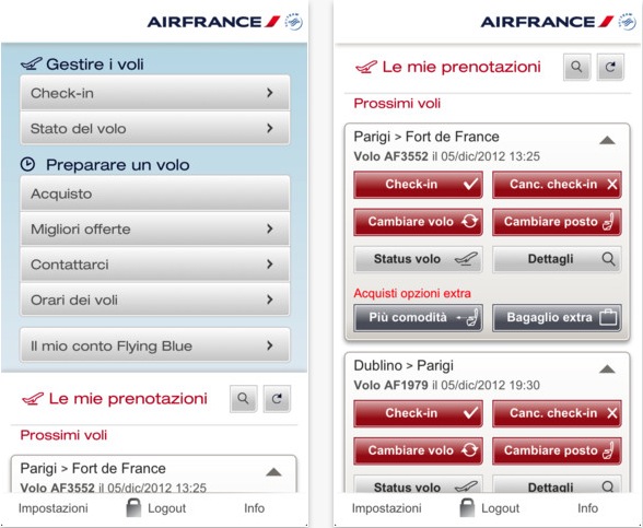 AirFrance ha aggiornato la sua app ufficiale Air France Mobile per iPhone alla versione 4.5.1. L’app permette di cercare e comprare i biglietti della compagnia di volo francese, effettuare o cancellare il check-in, cambiare volo o il posto assegnato (magari per sceglierne uno con più spazio per le gambe), perfino pagare il bagaglio extra e chiedere assistenza, ma, forse ben più importante, adesso è possibile salvare la carta d’imbarco direttamente nell’app Passbook di Apple.