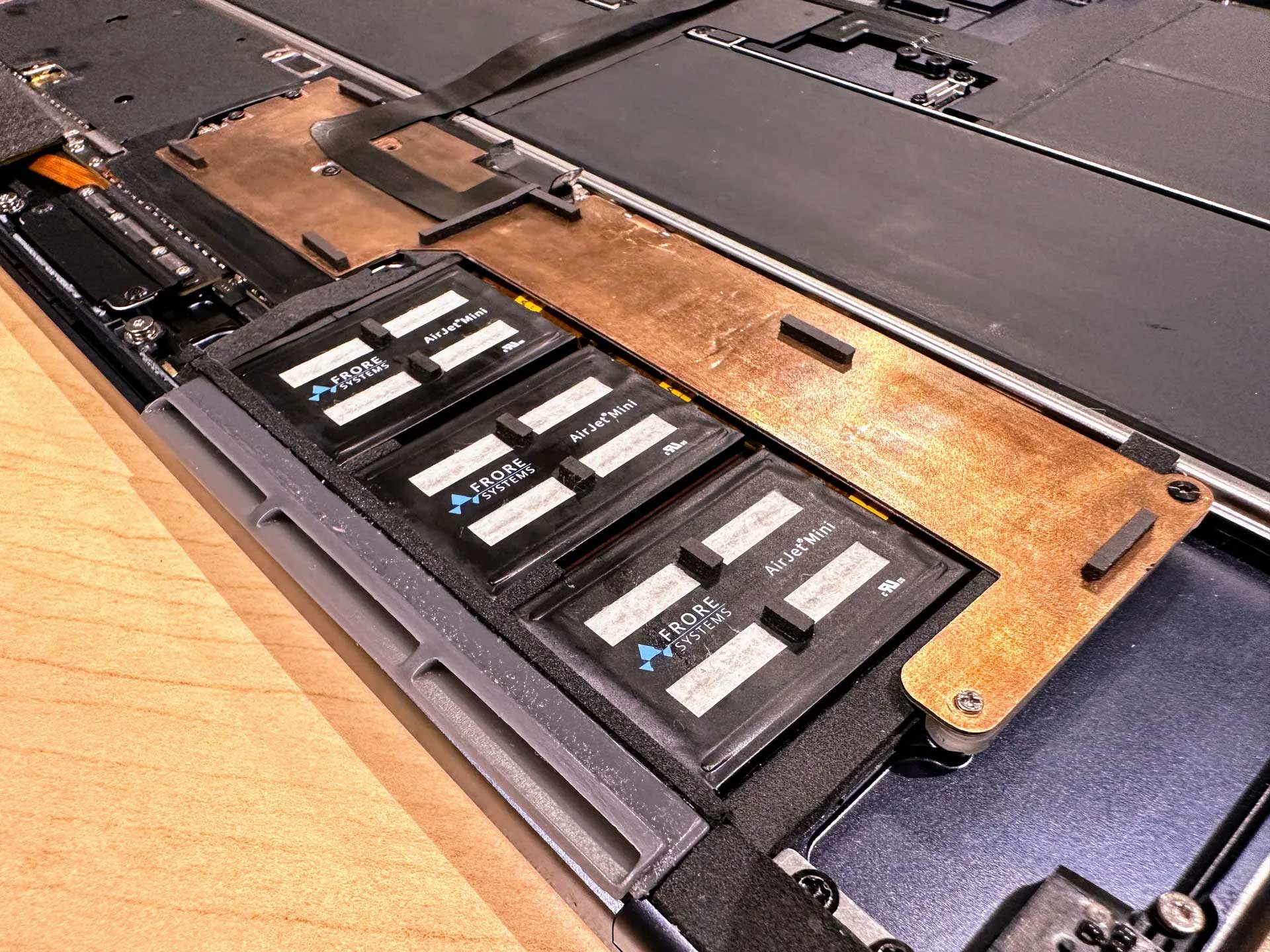 Un redattore del sito The Verge ha avuto modo di vedere un sistema AirJet sfruttato su un MacBook Air M2 da 15″ e il risultato è la possibilità di eseguire task intensivi per più tempo a maggiore velocità.