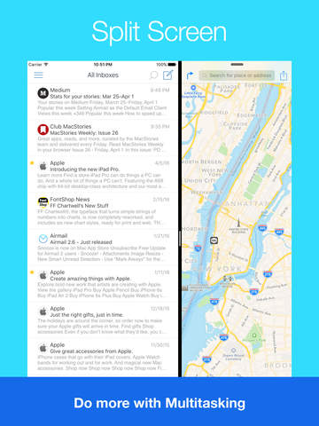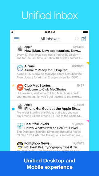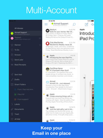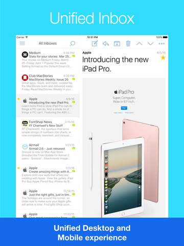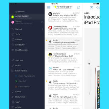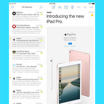 AirMail ha saputo imporsi come client di posta elettronica alternativo per la sua leggerezza e velocità nella gestione delle email, grazie al supporto di funzioni importanti, quali account multipli con tutti i principali servizi di posta, navigazione e scorciatoie via gesture e swipe, supporto 3D Touch dei nuovi iPhone 6s e 6s Plus, funzione snooze, notifiche interattive, azioni personalizzabili e molto altro ancora. La principale novità dell’ultimo aggiornamento 1.1 dell’app per iOS è certamente il supporto al grande schermo di iPad. La nuova versione introduce anche diverse migliorie, come le conferme di lettura, l’invio differito, le cartelle Smart, e nuovi pulsanti azione.