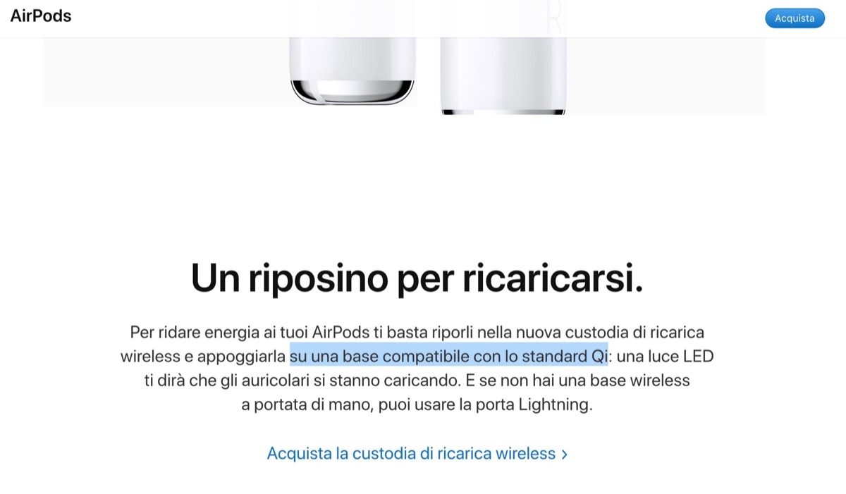 Oggi, l’ennesimo ritocco: da pochi minuti infatti la dicitura AirPower è stata completamente rimossa dalle pagine in cui veniva nominato la base Apple. Al suo posto, ad esempio nel punto in cui si parla di ricarica wireless nella pagina dei nuovi AirPods 2, viene riportato un più generico “basta riporli nella nuova custodia di ricarica wireless e appoggiarla su una base compatibile con lo standard Qi”.