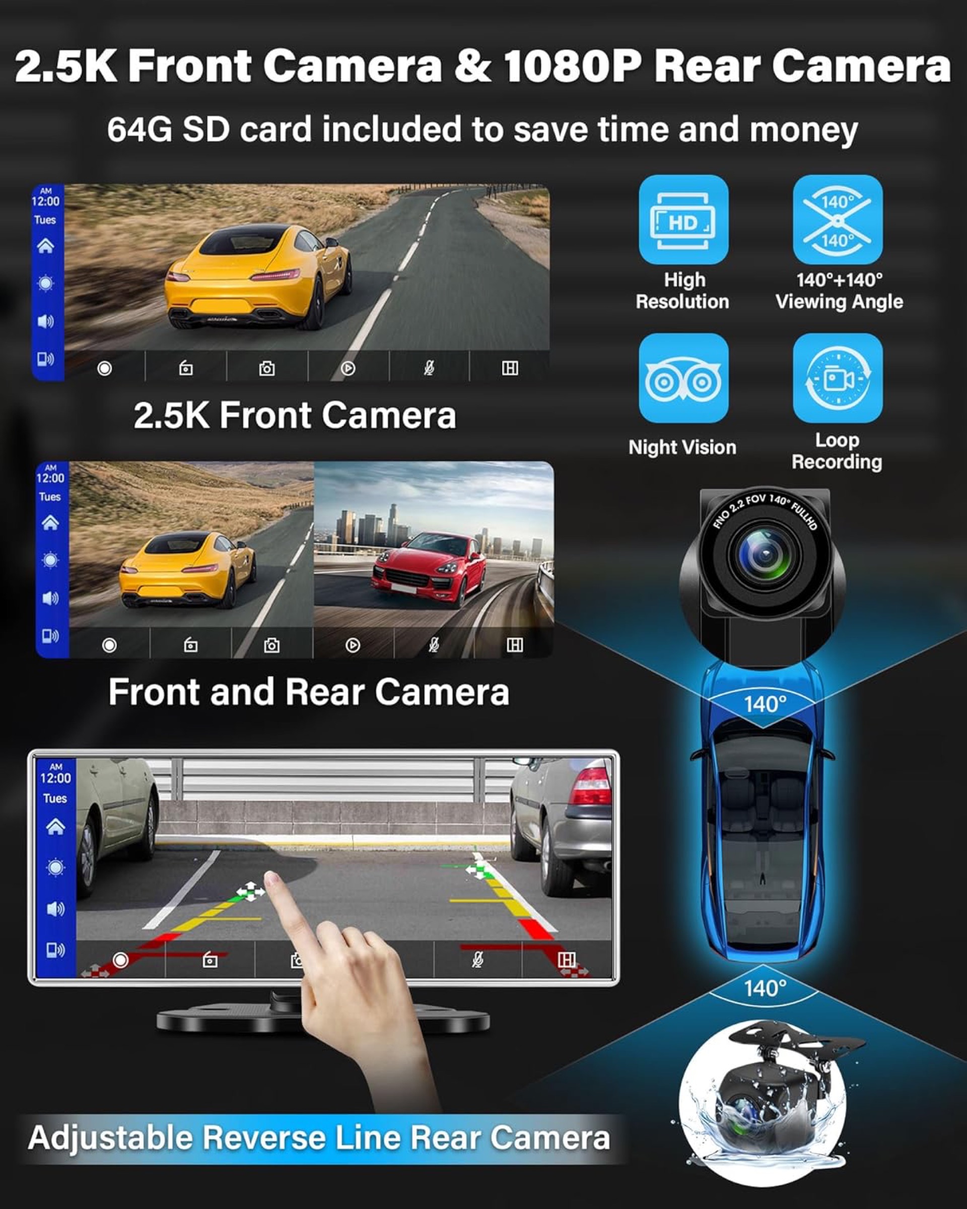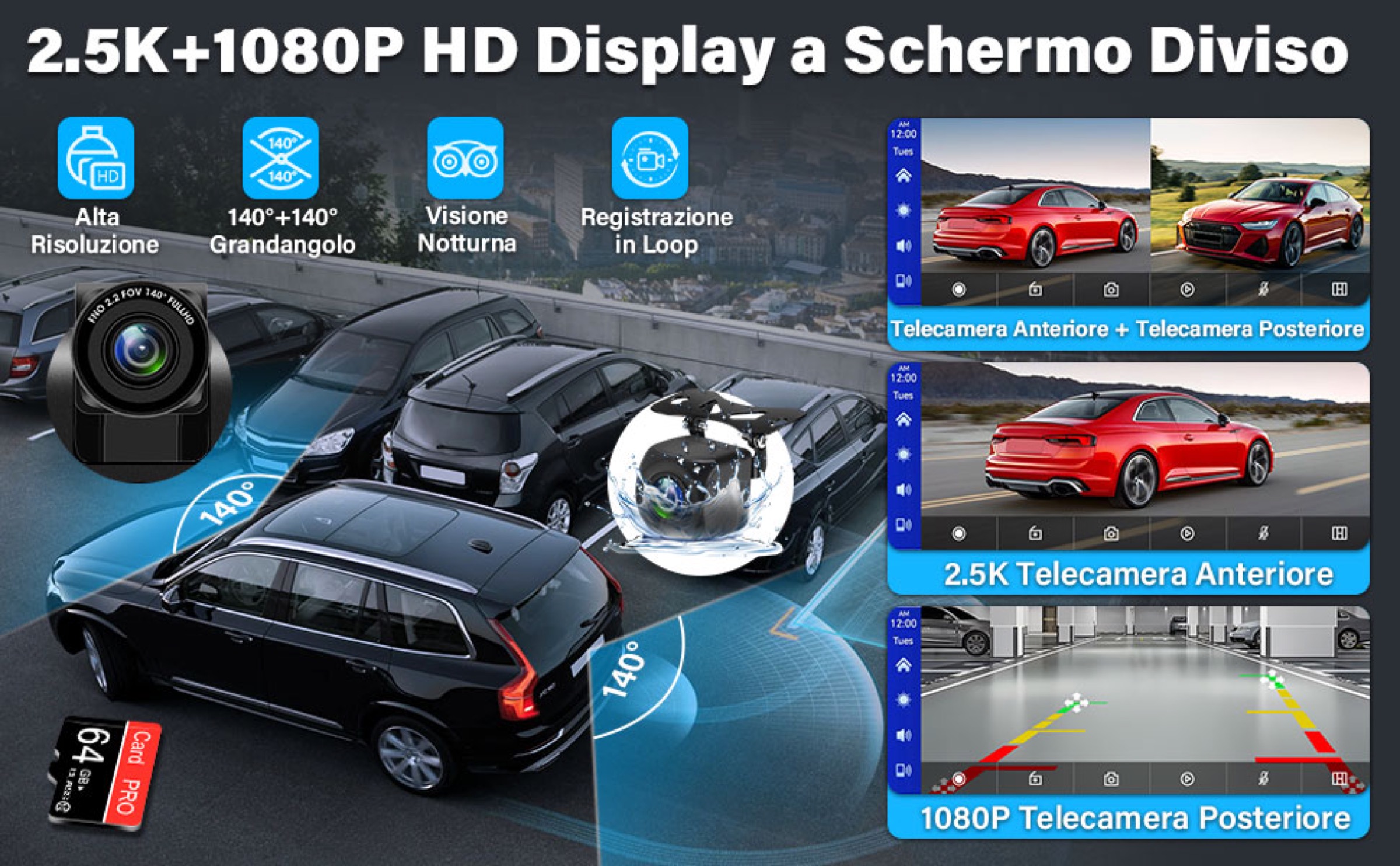 La posteriore, per altro impermeabile IP69, facilita le manovre di retromarcia grazie anche all’ausilio di linee guida virtuali. Tutte le immagini vengono salvate su una scheda microSD da 64 GB (inclusa) con tanto di modalità loop per la videosorveglianza del veicolo sia in viaggio che in sosta.