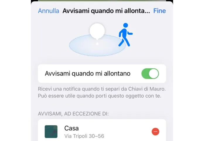 Con il lancio di iOS 15 Apple ha aggiunto una funzione di geofencing agli Airtag. In sostanza si tratta di un sistema con il quale possiamo definire il lancio di un avviso quando ci allontaniamo da un Airtag. Mediante l’app Dov’è è possibile selezionare l’AirTag che ci interessa e impostare su “Si”, l’opzione “Avvisami quando mi allontano”. È anche possibile indicare determinate posizioni per le quali non è necessario ricevere l’avviso (es. l’indirizzo di casa), utile per chi ha più AirTag che non sempre si portano appresso.