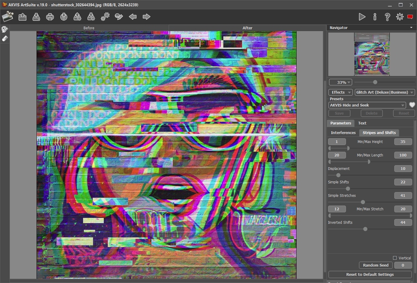 La recente versione di ArtSuite include una serie di preset pronti all’uso che consentono di provare una varietà di interpretazioni del moderno effetto glitch.