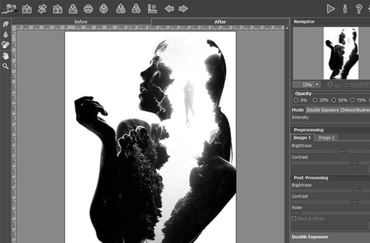 Il programma funziona in cinque modalità che consentono di ottenere diversi effetti: Montaggio, Camaleonte, Fusione, Emersione e Doppia esposizione.
