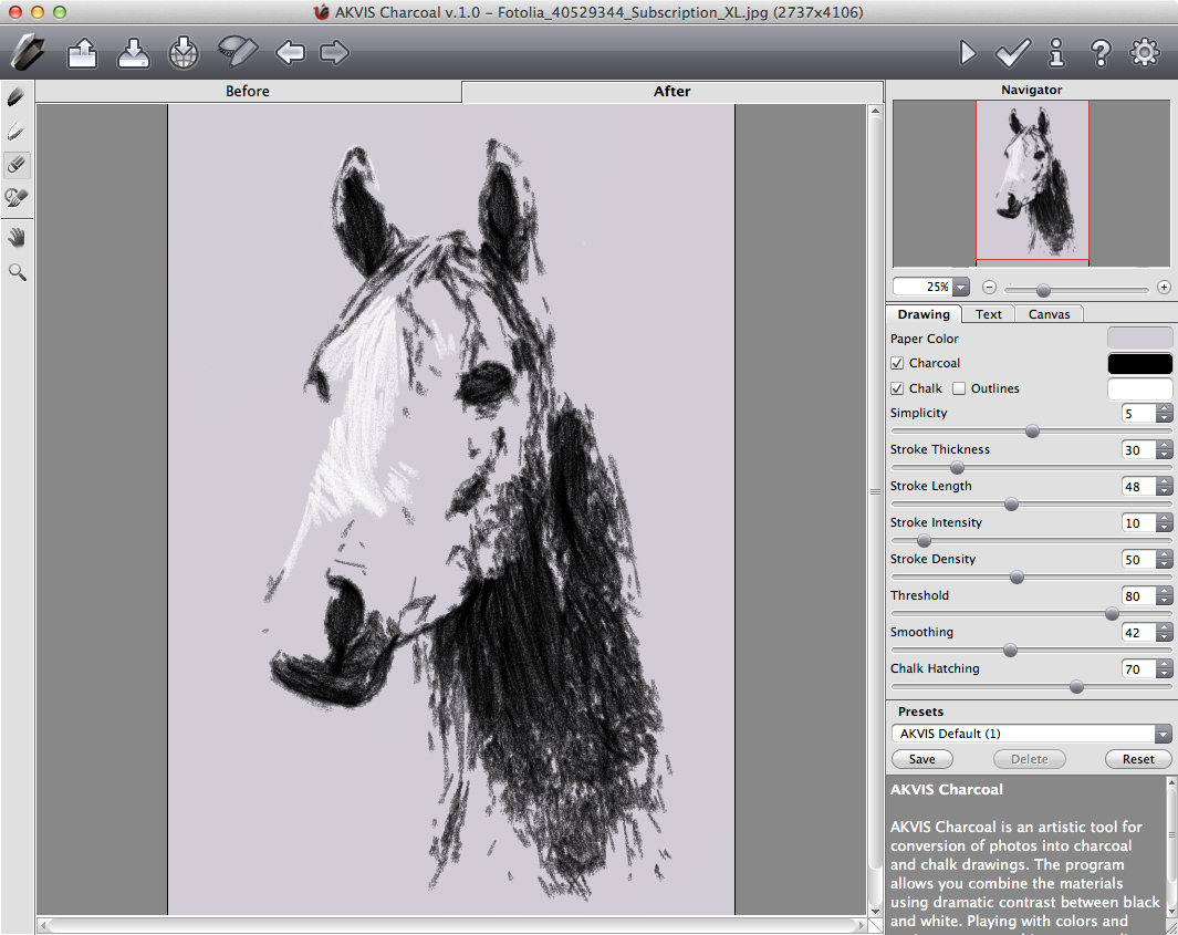 È possibile osservare la trasformazione della foto in un disegno a carboncino e gessetto in tempo reale; durante l’elaborazione sono visualizzate delle istantanee ed è possibile scegliere quella preferita.