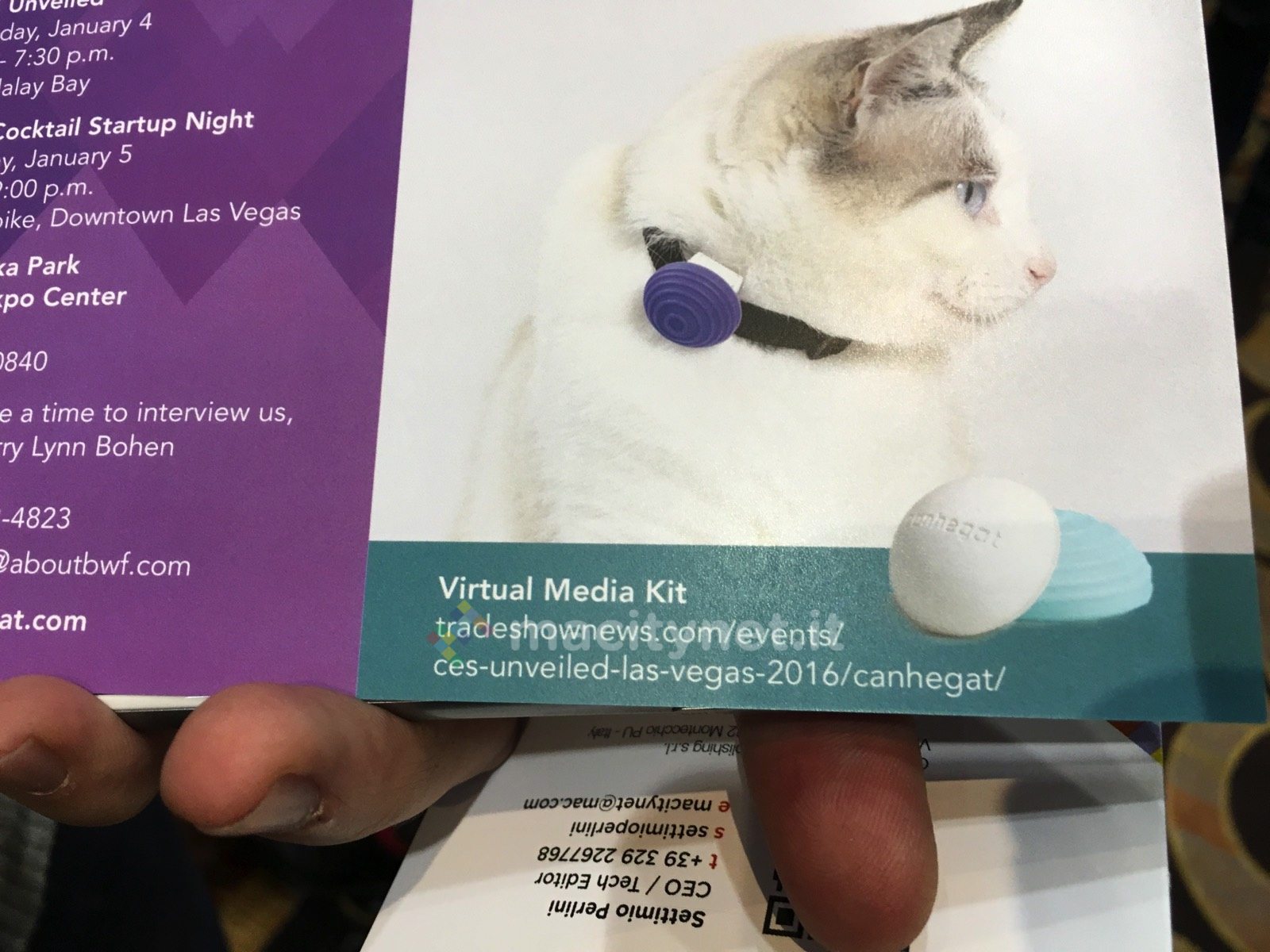 Al CES 2016 Canhegat ha presentato Canhe-fit, un collare che monitora l’attività e la salute degli animali domestici. Canhe-fit, fissato sul collare e indossato dal cane o dal gatto, permette ai proprietari di controllare l’attività quotidiana dei propri amici a quattro zampe e di sapere tutto sulla quantità di cibo che mangiano, sull’esercizio fisico che svolgono e sul dispendio energetico in base alla loro razza, all’età e al peso.