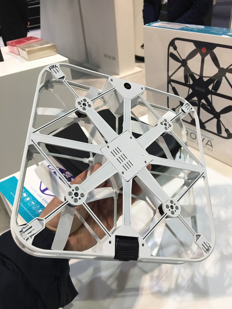ROVA è un drone di piccole dimensioni, di appena 20 cm per lato, con un peso di poco superiore ai 200 grammi. Sta in borsa ed è subito pronto al volo. E’ robusto, grazie a un corpo in fibra di carbonio e sicuro, progettato per il volo indoor, grazie alla posizione delle eliche “intrappolate” all’interno del corpo del velivolo, in modo da non risultare sporgenti. Dispone di camere per evitare la collisione con muri e ostacoli, mentre una camera primaria è in grado di scattare foto e registrare video a 1080p, e di inviare il flusso in streaming al proprio smartphone, con una risoluzione massima di 720p.