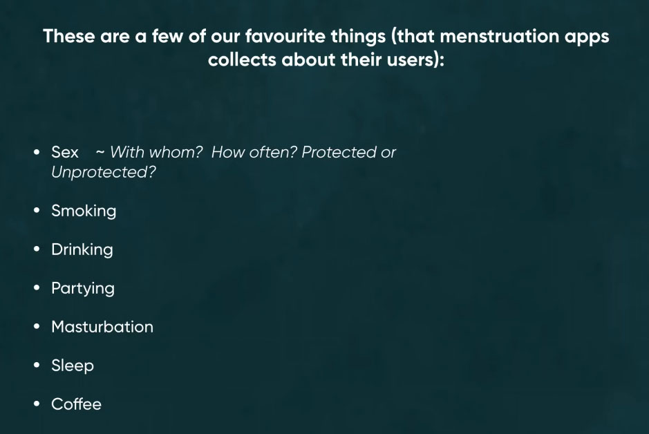 Kasperksy riferisce quanto riportato alla conferenza 36C3, da Privacy International, organizzazione per i diritti umani, che ha condiviso i risultati di uno studio sulle app che aiutano le donne a prevedere le mestruazioni, a monitorare la propria salute sessuale e a pianificare le gravidanze.