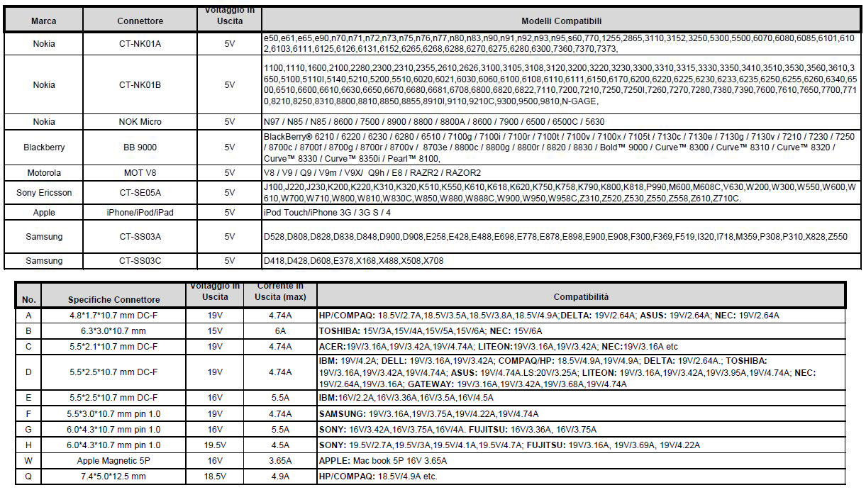 Nella confezione sono inclusi ben 10 connettori di ricarica per Notebook e 9 per cellulari e smartphone, per alimentare e ricaricare la batteria dei modelli e della marche più diffuse, tra cui il Magsafe e Dock 30 pin. Chi avesse a disposizione i nuovi modelli di Mac, quelli con Magsafe 2, potrà usare un adattore da vecchio a nuovo connettore Magsafe (10 euro su Apple Store), oppure sfruttare, nel caso di iPhone, il cavo incluso nella confezione originale del prodotto. L’uscita USB è da 5V, sufficienti per la maggior parte dei dispositivi portatili; nel caso di iPad, specialmente i modelli più recenti, l’iPad si ricarica più lentamente.