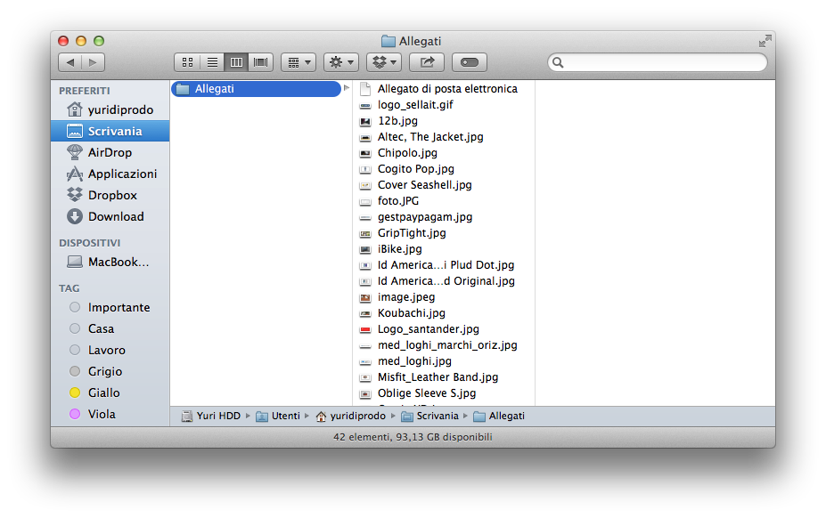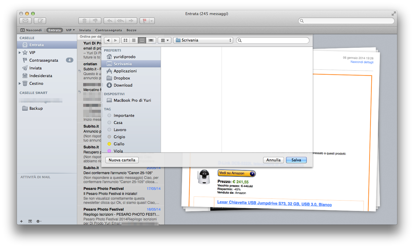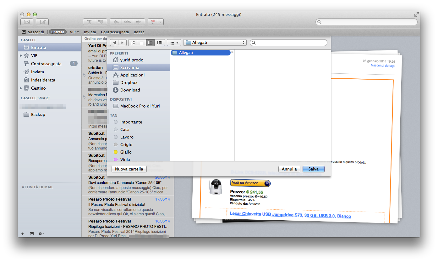 In alternativa, potrete salvarli raggruppandoli tutti insieme in una sola cartella selezionando inizialmente tutte le mail dalla casella Entrata tramite cmd+A, successivamente cliccate su File > Salva allegati…, create una cartella (magari direttamente all’interno dell’hard disk esterno) e cliccate su Salva: immagini, pdf e qualsiasi altro allegato verrà memorizzato al suo interno.