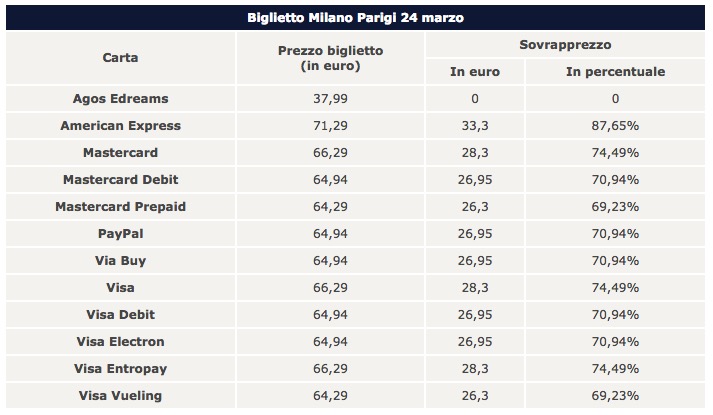 Le cinque OTA segnalate (ma non solo loro) sono solite applicare al prezzo finale un “balzello” percentuale aggiuntivo nel caso in cui si decida di pagare con carta di credito, questo probabilmente per recuperare le commissioni dei circuiti delle società di credito come Visa, Mastercard e American Express, a carico dell’operatore. Peccato che l’utente, attirato dai prezzi inizialmente vantaggiosi, si trovi a volte a dover pagare cifre molto più elevate. Basta osservare la tabella qui di seguito per rendersi conto del lievitare dei prezzi, per esempio, nel caso di un biglietto Milano Parigi su eDreams, che passa dai 37.99 euro pubblicizzati sul sito ai 71,29 euro per il pagamento via American Express.