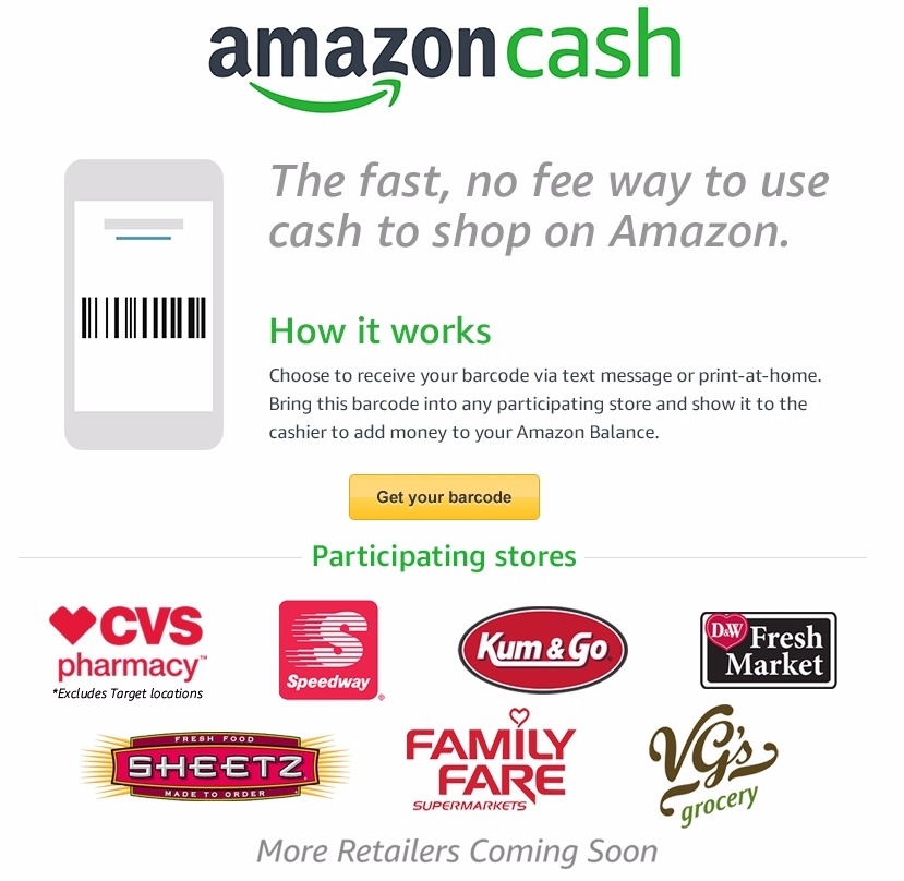 Basta collegarsi alla pagina amazon.com/cash, creare un codice a barre personalizzato e recarsi in uno dei più di 10.000 rivenditori che partecipano all’iniziativa: grazie al codice a barre personalizzato sarà possibile depositare il denaro sul proprio account Amazon, per avere a disposizione un credito da spendere sull’e-commerce.