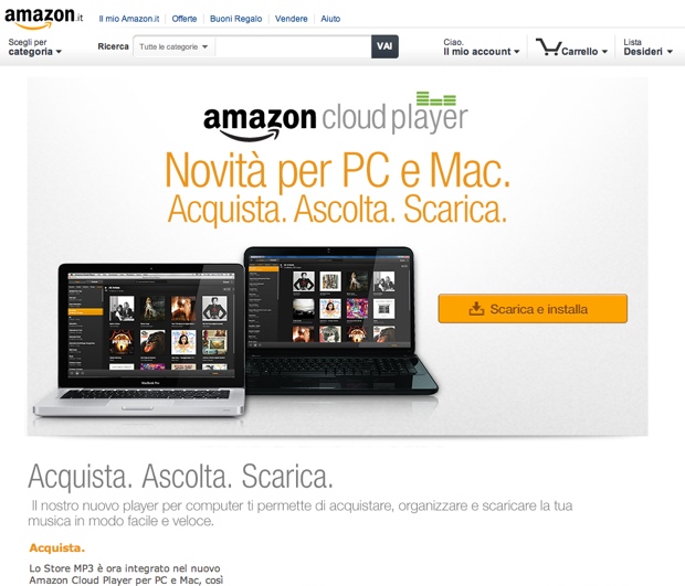 Amazon annuncia la disponibilità anche per l’Italia del software Amazon Cloud Player per Mac e PC: ricordiamo che alla fine di ottobre era già stato rilasciato in USA. Grazie a questo applicativo gli utenti possono gestire la propria raccolta musicale, sia i brani memorizzati sul computer, sia quelli conservati sul cloud di Amazon.