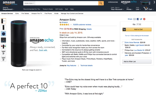 Amazon Echo, il computer vocale per la casa ospitato in un futuristico cilindro nero è stato accolto con calore in USA a novembre 2014, quando è stato reso disponibile per un limitato numero di utenti solo su invito. Da oggi invece Amazon Echo può essere acquistato da chiunque negli Stati Uniti al prezzo di 180 dollari, circa 160 euro, con spedizioni previste a partire dal 14 luglio.