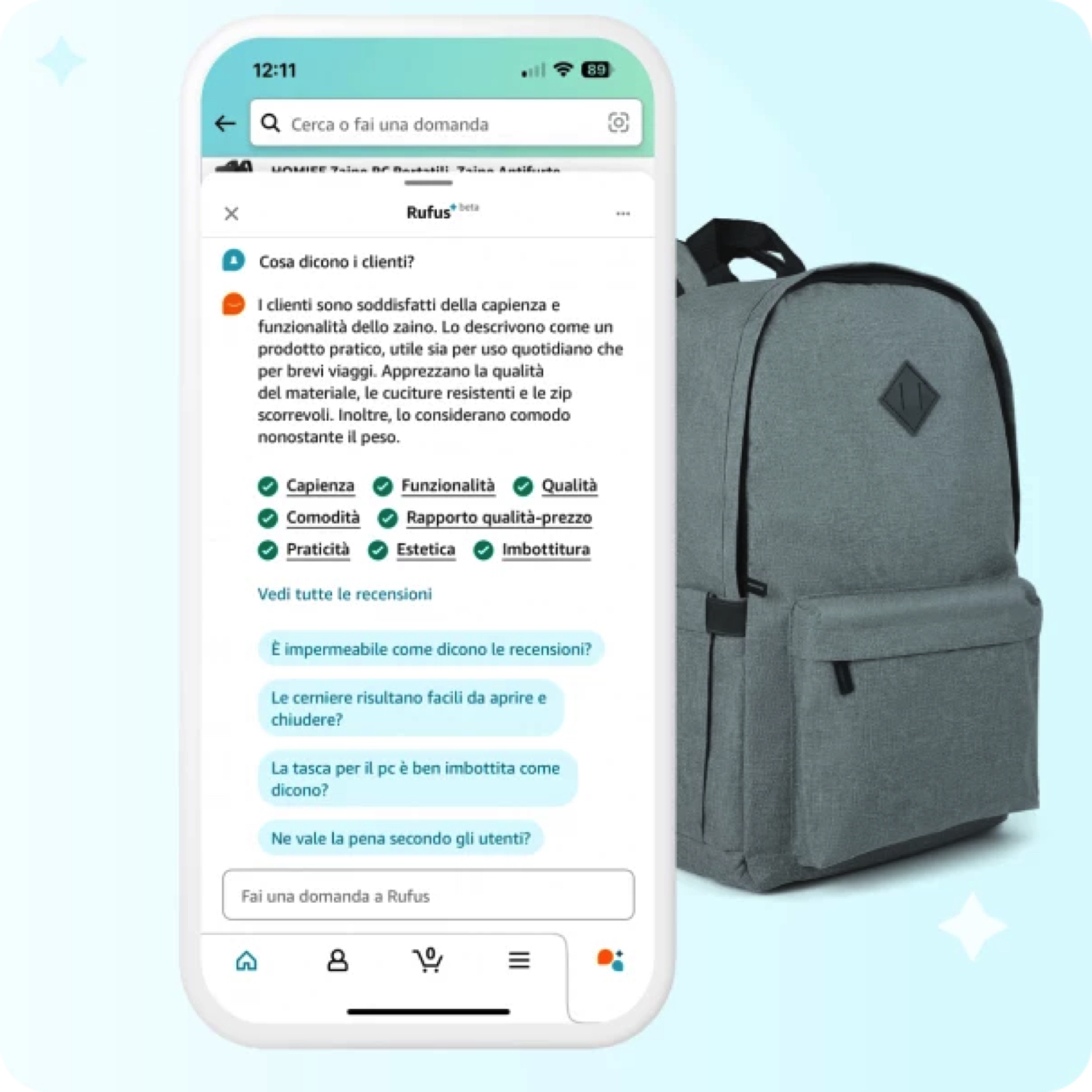 Tutto questo è possibile perché Rufus è stato addestrato non solo sull’intero catalogo prodotti Amazon, incluse le ultime novità, ma anche sulle recensioni, domande e risposte degli utenti, a cui si aggiungono anche informazioni delle schede prodotto e di altri dati raccolti via Internet.