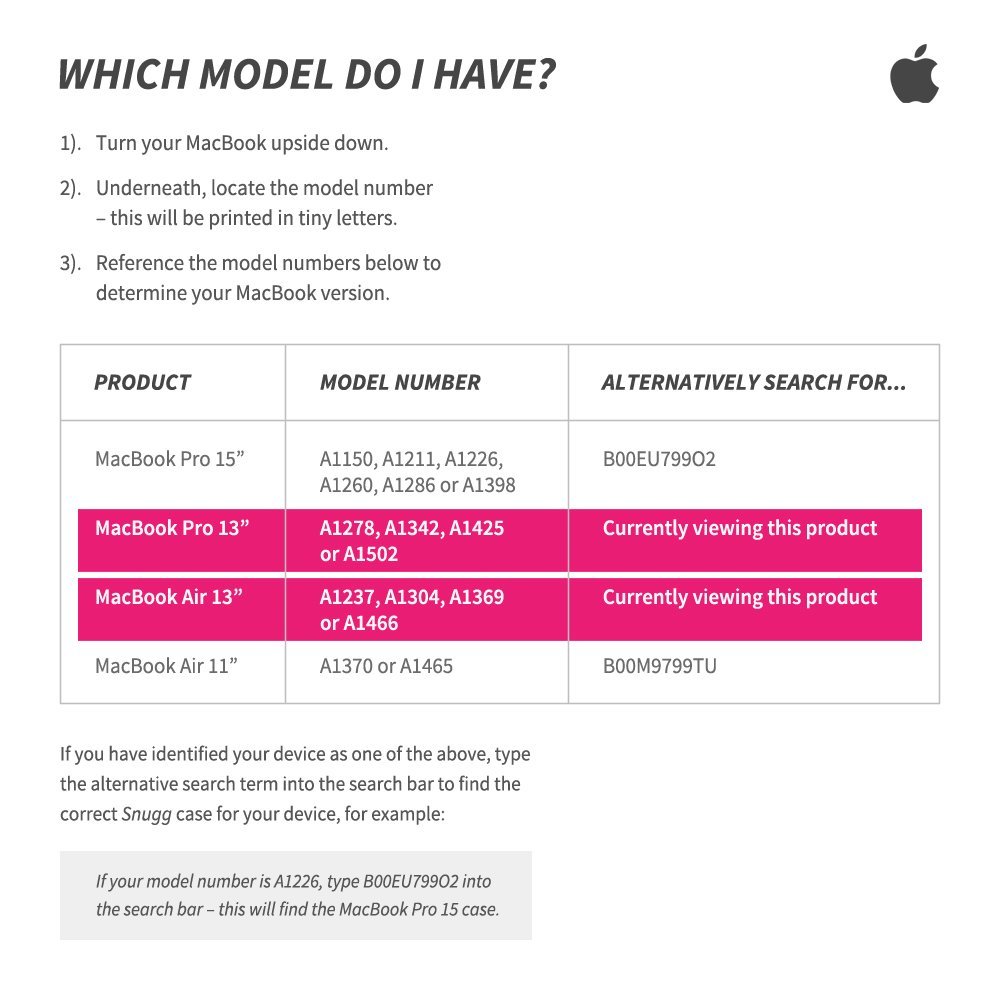 Se siete incerti sul modello compatibile, nella nostra galleria sottostante, accanto alle immagini del prodotto, trovate anche una tabella con i modelli compatibili con le custodie Snugg. Il modello del Mac è stampato a piccoli caratteri sul retro del dispositivo.