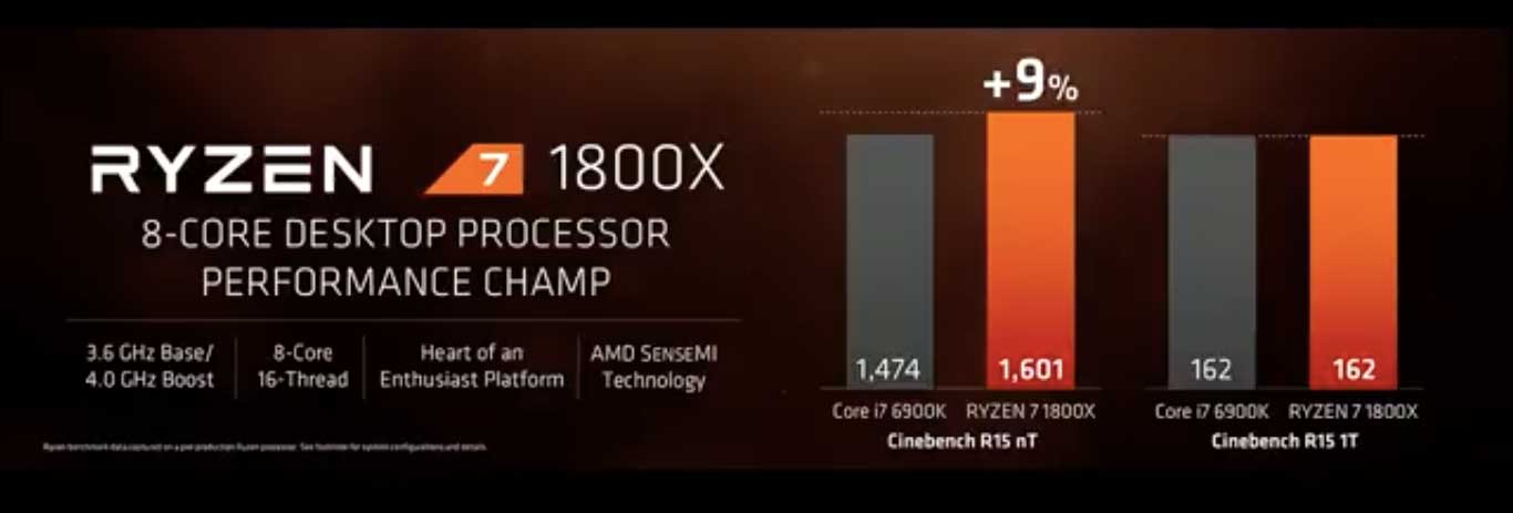 AMD afferma che le prestazioni sono allineate e in alcuni casi superano quelle dei concorrenti. In una demo con Cinebench R15 e Handbrake è stata mostrato un Ryzen 7 1800X evidenziando maggiore velocità nel multi-threaded rispetto a una soluzione 8-core, 16-thread Intel Core i7-6900K.