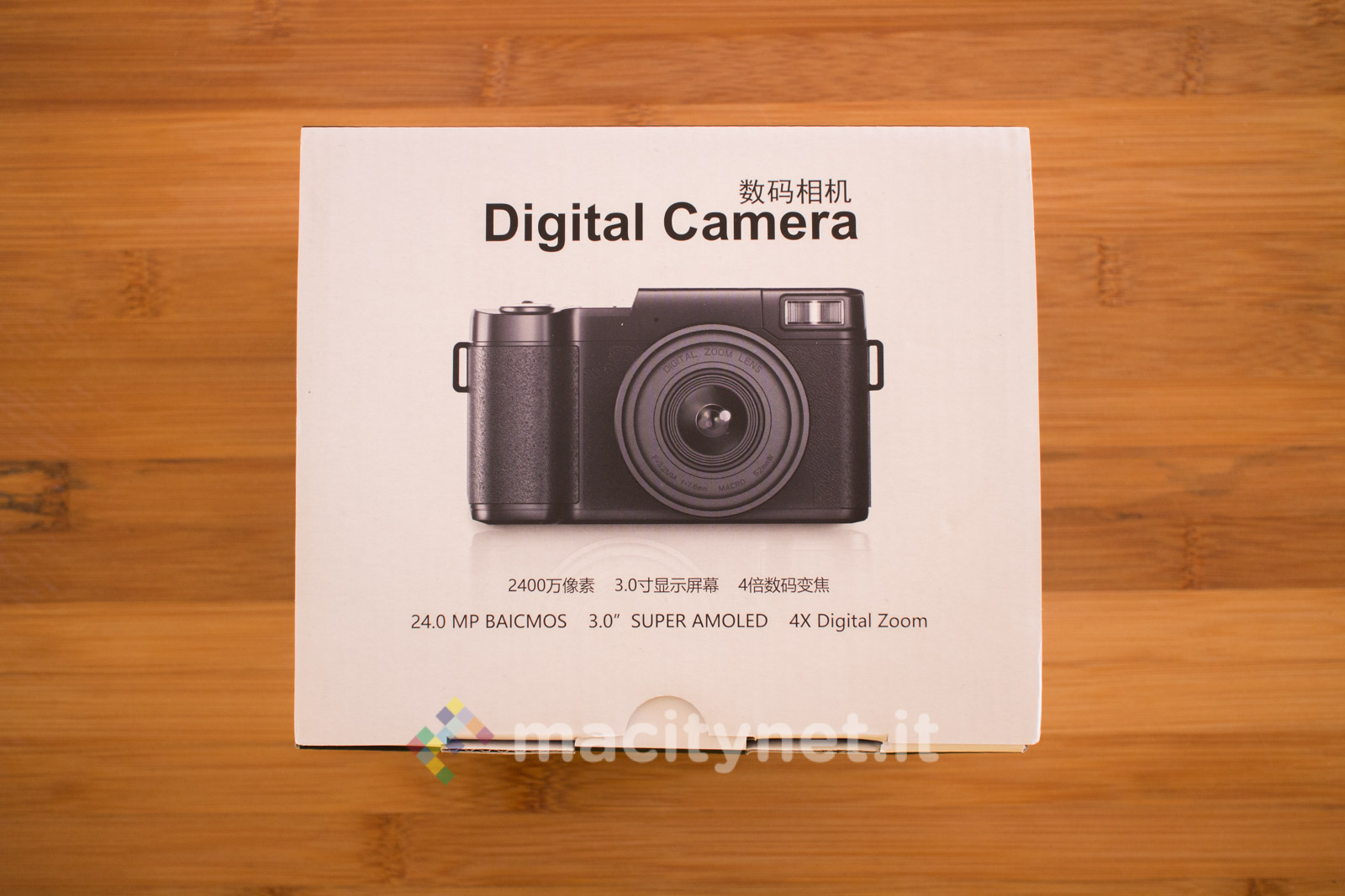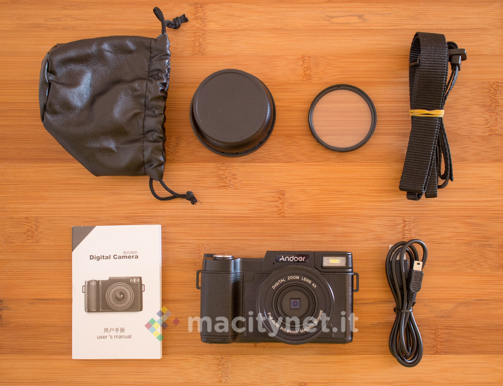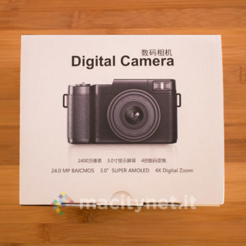 Esternamente, la confezione non è poi così diversa dalle scatole di fotocamere ben più costose, con illustrazioni che mettono in evidenza l’estetica della fotocamera e le sue principali specifiche tecniche (in cinese). Al suo interno, oltre alla camera, troviamo diversi accessori, tra cui il manuale utente, il cavo miniUSB per la ricarica, la tracolla, un filtro UV, due obiettivi intercambiabili ed una sacca per il trasporto di questi ultimi.