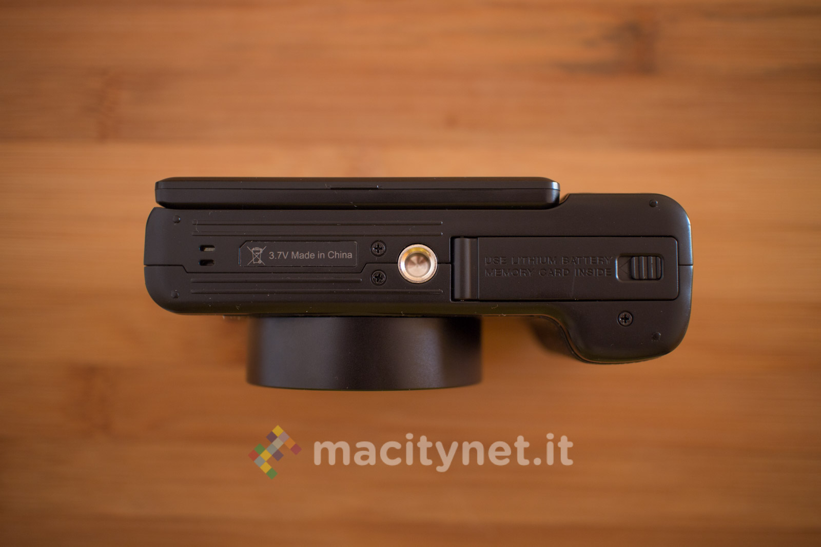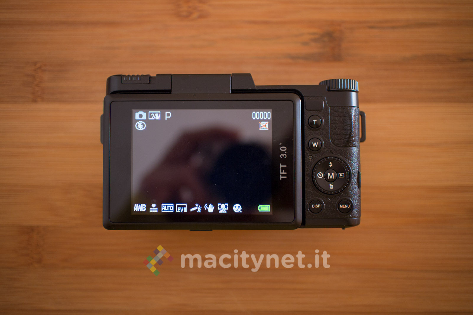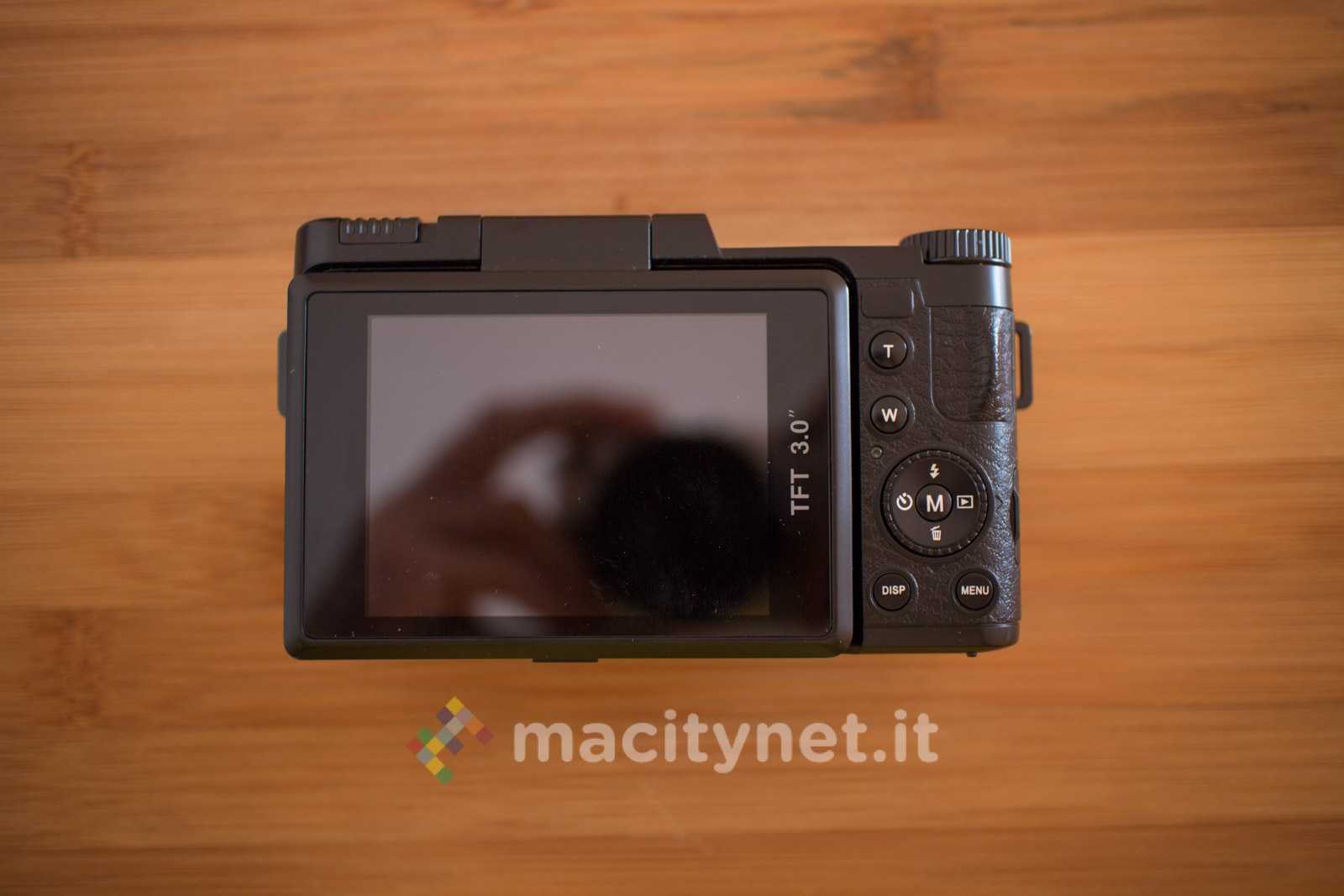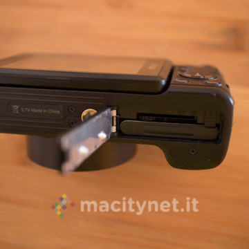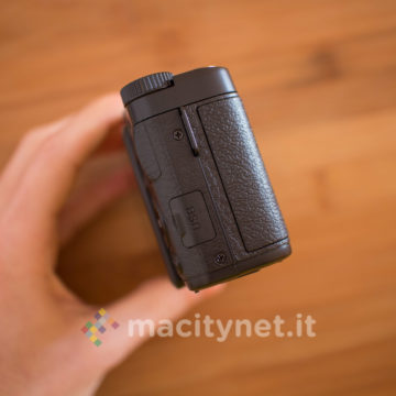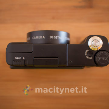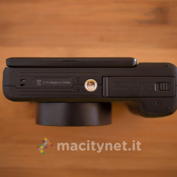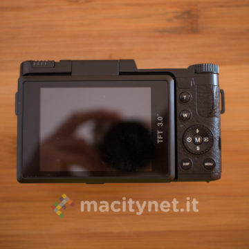 Sulla base c’è un attacco standard a vite 1/4‘’ per l’aggancio ad un treppiede ed il cassetto per batteria e scheda SD, sul retro invece ci sono i tasti T e W per lo zoom digitale 4X, il tasto DISP, MENU e la ghiera multifunzione, oltre al display TFT da 3 pollici inclinabile per funzionare soltanto come pratico monitor in autoscatti e selfie: non è infatti possibile bloccarlo in altre posizioni ad esempio a 45–90 gradi per facilitare alcuni scatti rasoterra o in altre particolari angolazioni. Sul lato superiore infine, oltre al tasto di scatto c’è uno switch per sganciare il Flash LED ed il tasto ON/OFF oltre ad una ghiera che ha purtroppo solo una funzione estetica in quanto è bloccata e non offre alcuna funzione.