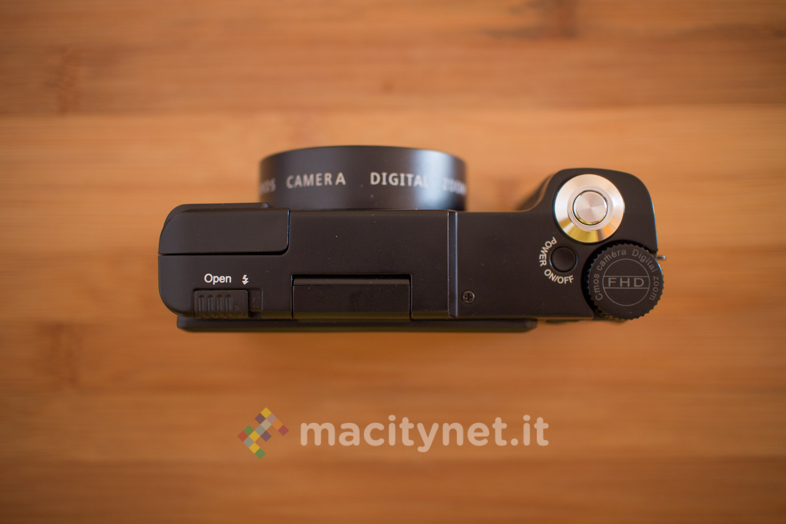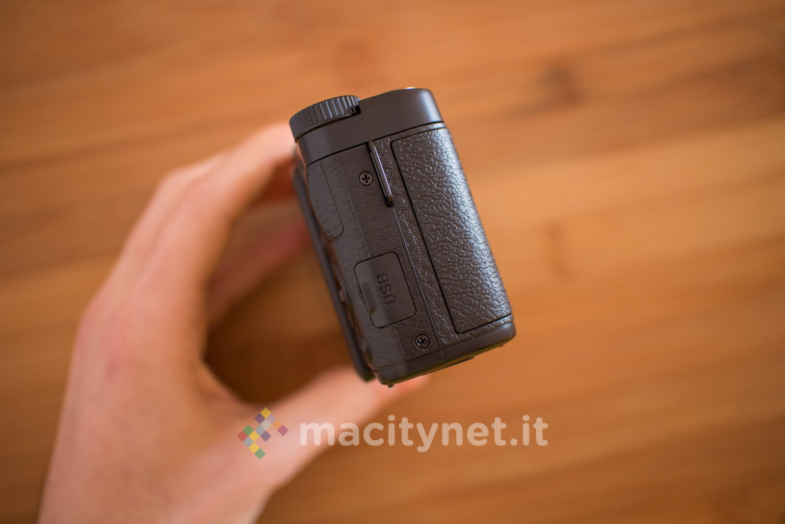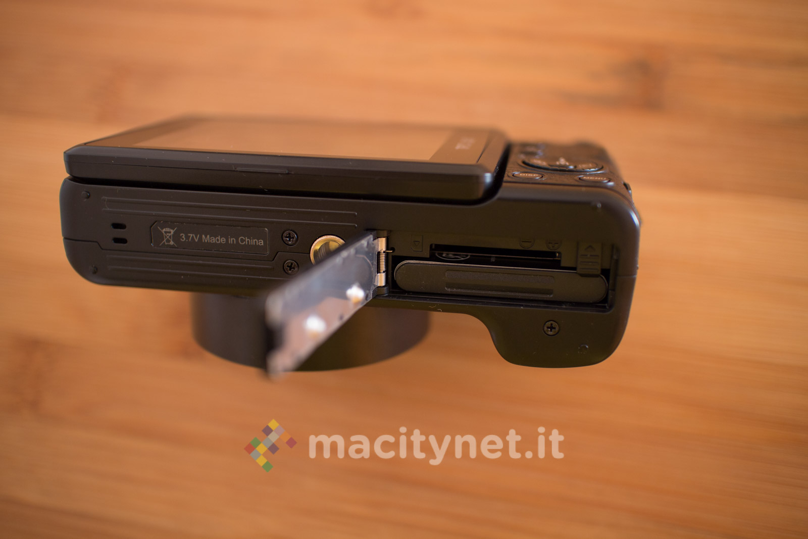 Sulla base c’è un attacco standard a vite 1/4‘’ per l’aggancio ad un treppiede ed il cassetto per batteria e scheda SD, sul retro invece ci sono i tasti T e W per lo zoom digitale 4X, il tasto DISP, MENU e la ghiera multifunzione, oltre al display TFT da 3 pollici inclinabile per funzionare soltanto come pratico monitor in autoscatti e selfie: non è infatti possibile bloccarlo in altre posizioni ad esempio a 45–90 gradi per facilitare alcuni scatti rasoterra o in altre particolari angolazioni. Sul lato superiore infine, oltre al tasto di scatto c’è uno switch per sganciare il Flash LED ed il tasto ON/OFF oltre ad una ghiera che ha purtroppo solo una funzione estetica in quanto è bloccata e non offre alcuna funzione.