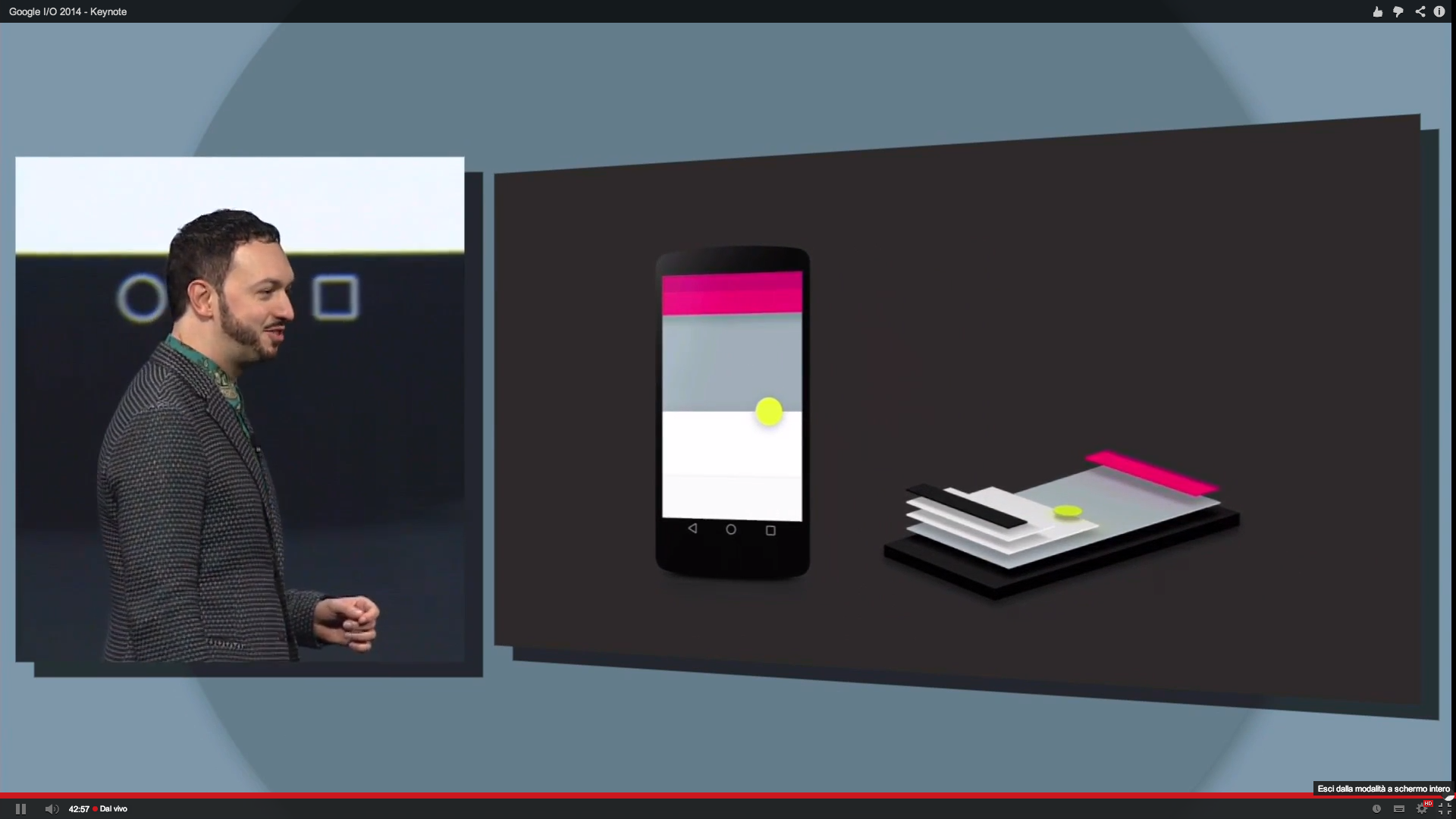 Google cambia strategia e per la prima volta decide di presentare in anteprima in un evento pubblico quello che sarà il prossimo sistema operativo Android. Il colosso non ha parlato di Android 5.0, ma il nome scelto per mostrare grandi cambiamenti grafici è Android L, supportato da un’interfaccia completamente nuova denominata “Material Design”. La casa di Mountain View, insomma, adotta la stessa strategia di Apple: presentare il proprio OS durante un Keynote; anche per questo, Android L con Material Design UI, può essere considerato la risposta di Google a iOS 8 ufficializzato durante lo scorso WWDC 2014.