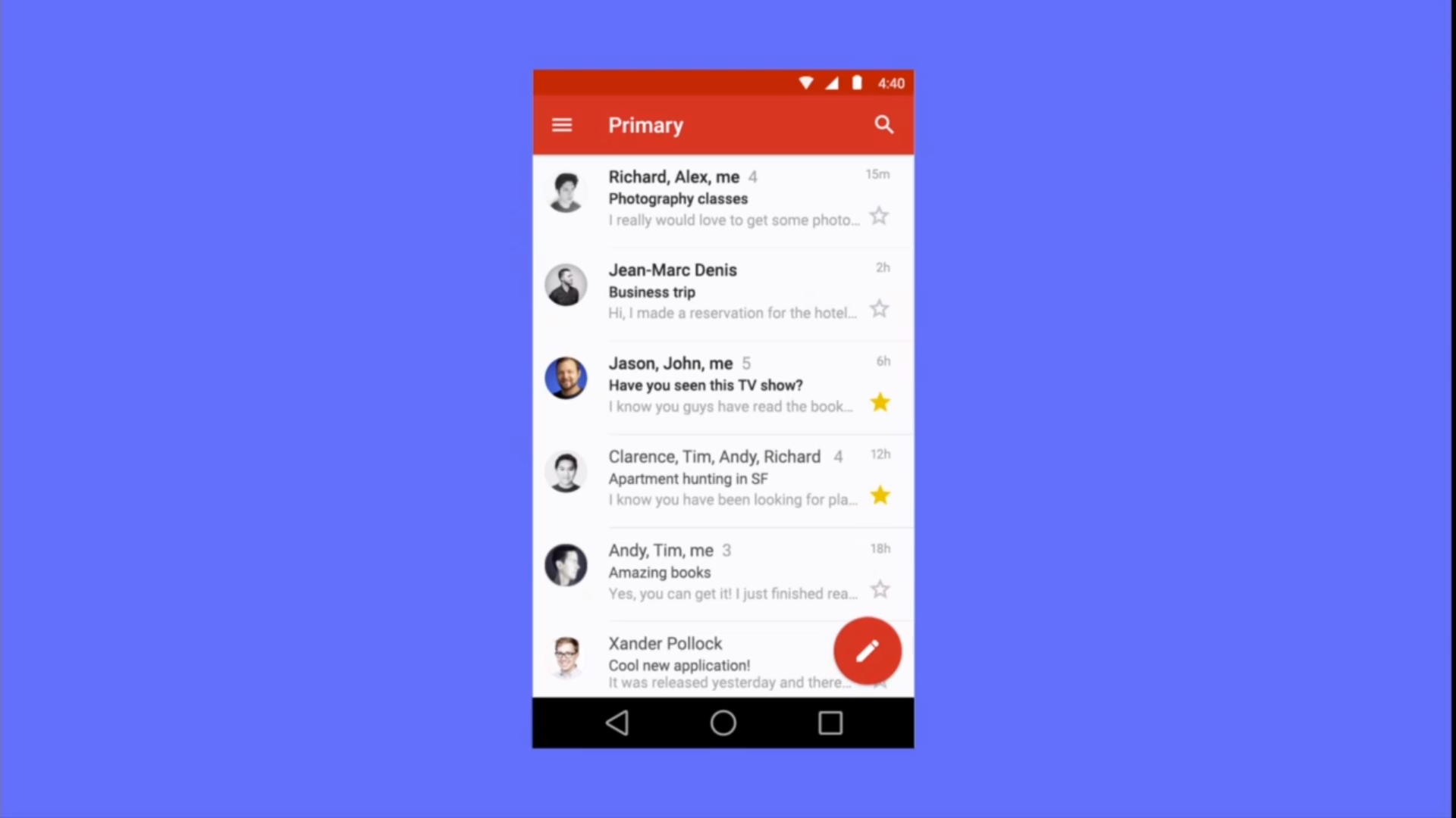 Il più grande cambiamento grafico apportato da Material Design è l’introduzione di illuminazioni e ombre in tempo reale per ogni applicazione. Secondo Google con Material Design gli sviluppatori potranno creare applicazioni più raffinate dal punto di vista grafico, anche se la nuova veste è molto minimale e accessibile. L’idea di base portata in Android L da Material Design è di avere finestre operanti su diverse altezze. Ad esempio, alle schermate tradizionali di ciascun’applicazione potranno essere sovrapposte delle icone fluttuanti sullo schermo, che risaltano in primo piano. Giusto a titolo esemplificativo durante il keynote è stato mostrato il funzionamento del nuovo dialer con interfaccia Material Design: in sottofondo sono presenti le tradizionali schermate dei contatti, mentre un’icona circolare fluttuante sullo schermo permette di richiamare la tastiera. Questa struttura potrà essere riproposta in molteplici applicazioni, come ad esempio in Gmail, dove sulle tradizionali schermate della posta risalterà il pulsante in rosso per scrivere un nuovo messaggio.